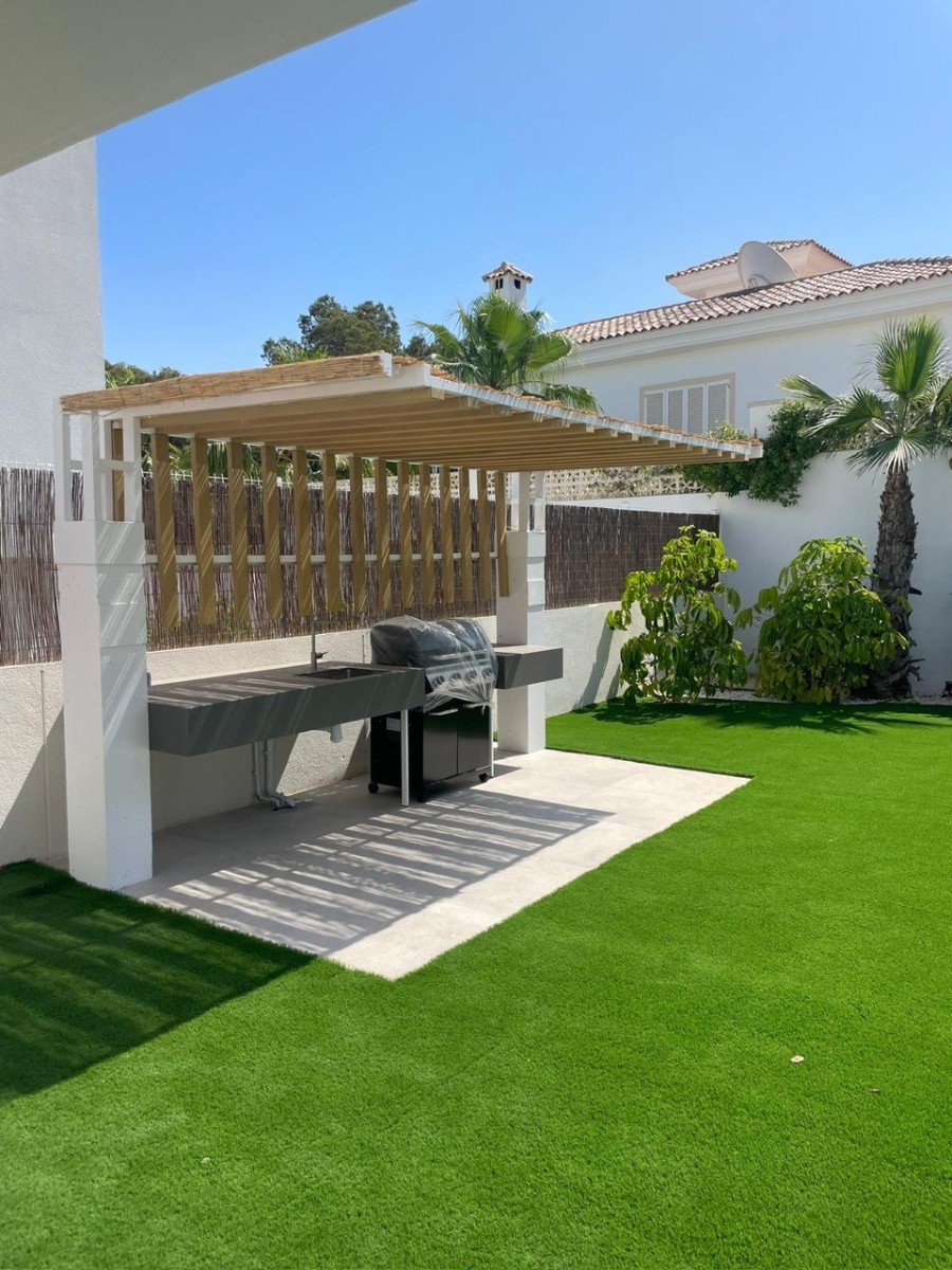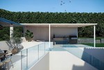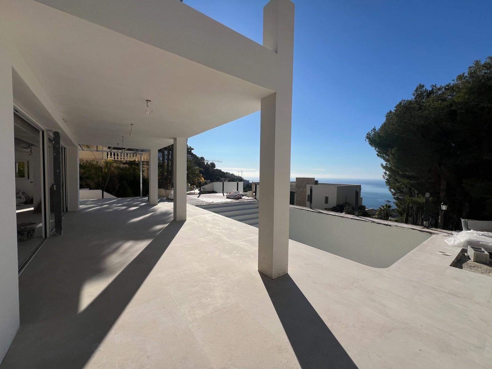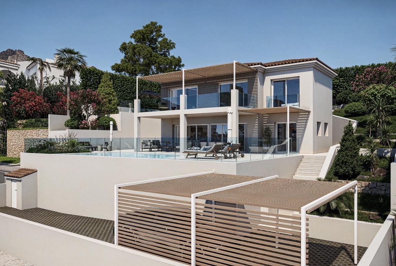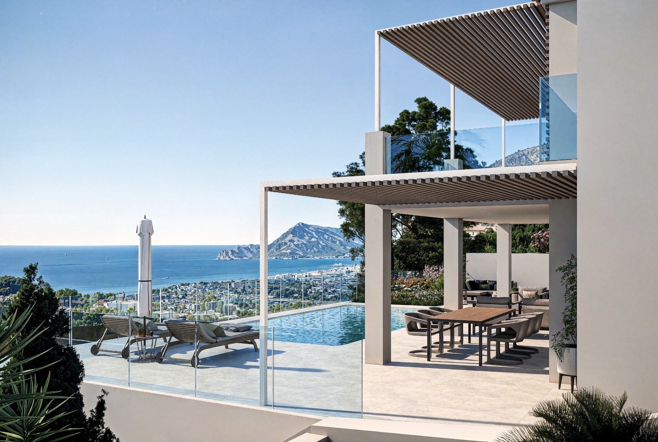De woning heeft een woonoppervlakte van 190,90 m² en is gelegen in een privé urbanisatie met zuidoriëntatie en is verdeeld over 2 verdiepingen.De begane grond heeft een volledig uitgeruste semi-gesloten keuken, gastentoilet, een ruime en lichte woon-eetkamer met toegang tot het gedeeltelijk overdekte terras en met een pergola aan de linkerkant. Via een binnentrap komen we op de eerste verdieping, waar we een slaapkamer hebben aan de linkerkant met een klein balkon, dan hebben we een en-suite slaapkamer met badkamer, nog een slaapkamer en een badkamer. Beide slaapkamers komen uit op een overdekt terras met pergola, met prachtig uitzicht op zee en de regio.De villa is uitgerust met airconditioning (warm-koud) in woon-eetkamers en slaapkamers, vloerverwarming door middel van aerothermische, automatisch irrigatiesysteem voor de tuin, elektrische rolluiken voor slaapkamers, gepantserde toegangsdeur en dubbele beglazing. Bovendien kunnen tegen meerprijs de volgende opties worden geïnstalleerd: zonnepanelen, warmtepomp voor het zwembad en een alarmsysteem met videobewaking.Het huis ligt op 7,5 km van de stad, 7 km van het strand, 4 km van de snelweg en 74 km van het vliegveld van Alicante.