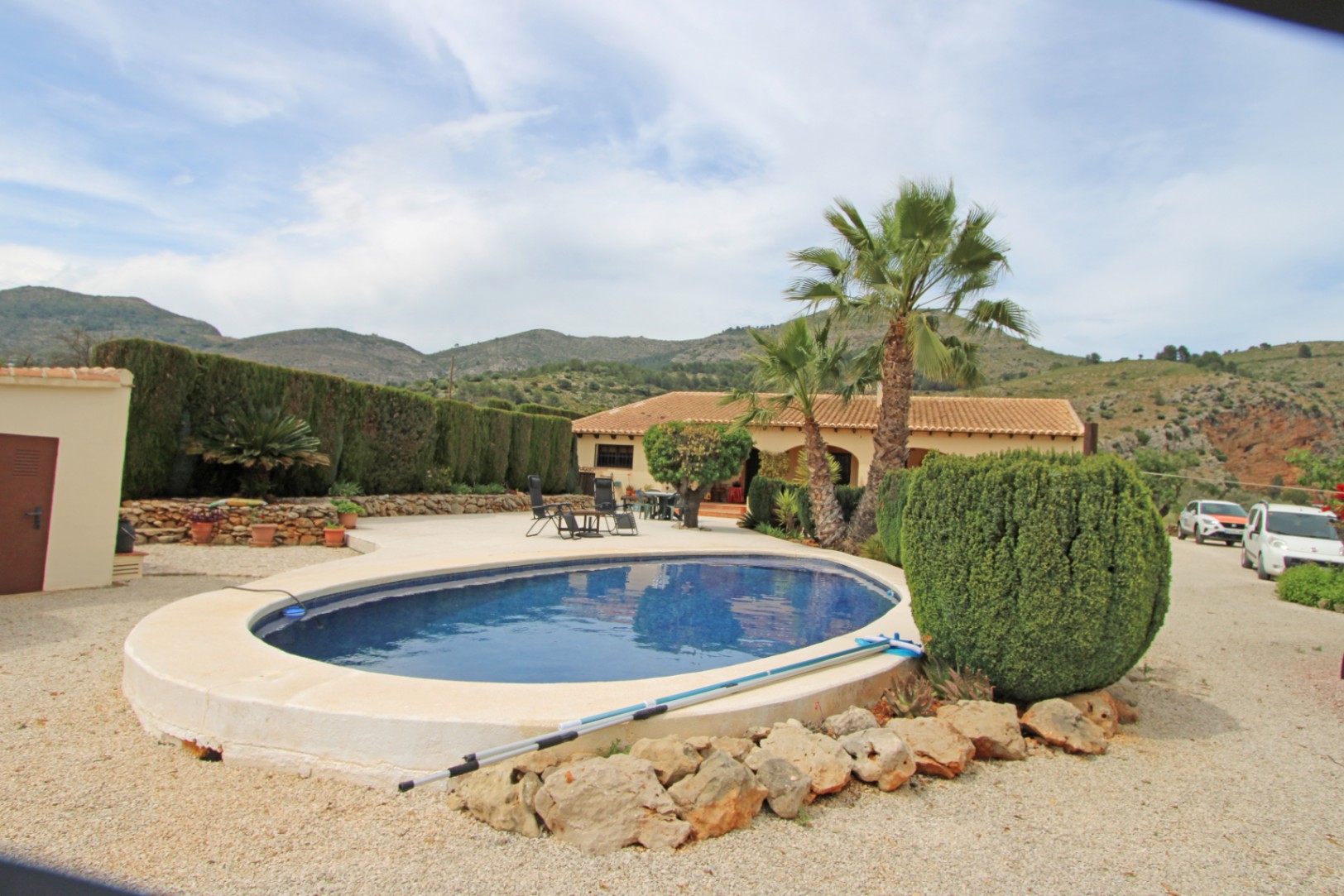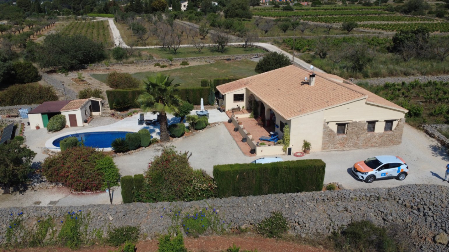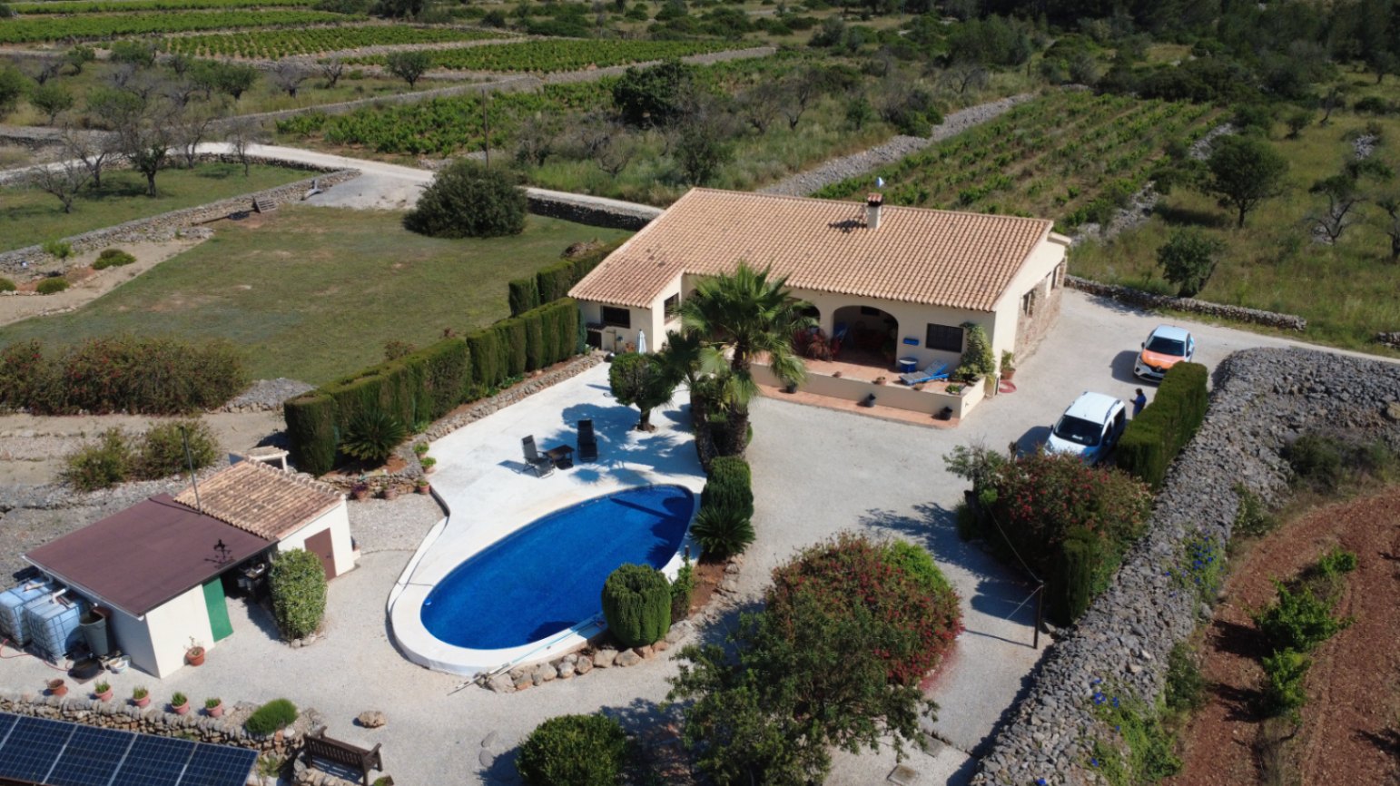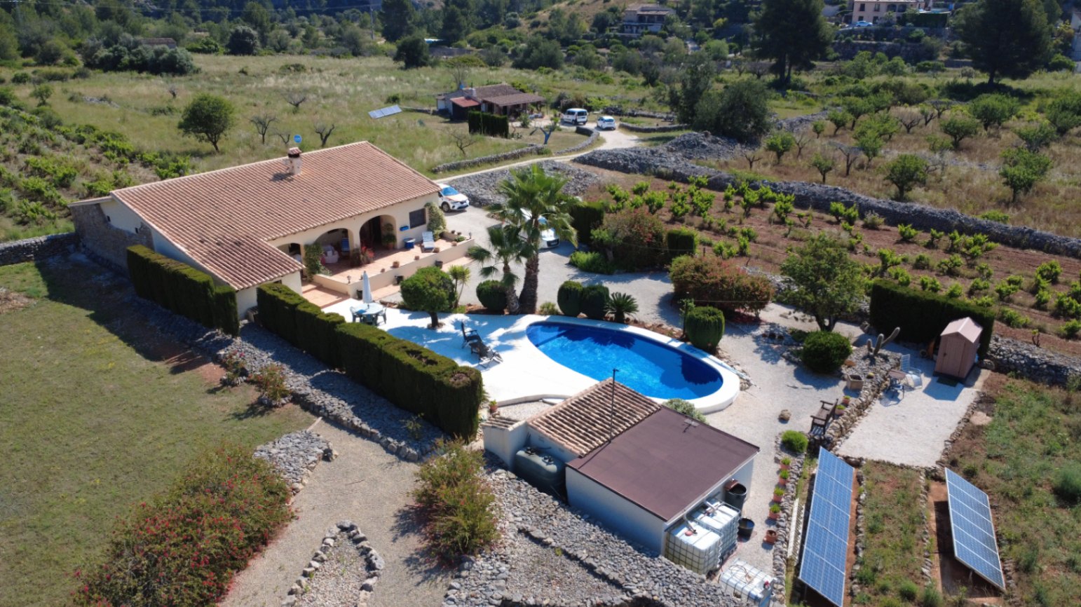 Charming Finca-Style Villa with Stunning Views in Idyllic Jalon Valley Setting This beautiful finca-style property exudes charm and character, perfectly positioned in a peaceful, private location just a short walk from the picturesque villages of Jalon and Lliber. Boasting breath-taking southwest-facing views, this home offers an ideal blend of traditional craftsmanship and modern comfort. The accommodation is arranged across a single level and is accessed through a spacious covered Riu Rau and traditional naya, showcasing classic stonework typical of the region—an ideal space to relax and soak in the spectacular valley views. Inside, the welcoming lounge and dining area features exposed wooden beams and a cosy wood-burning fireplace, creating a warm and inviting ambiance. Adjacent to the dining space is a fully fitted kitchen that enjoys views over the pool and garden, seamlessly combining practicality with charm. The hallway leads to four double bedrooms, including a spacious master suite complete with en-suite bathroom, dressing room, private gym space, and direct access to the terrace. Three additional double bedrooms with fitted wardrobes provide flexibility; one is currently used as an office/study. A well-appointed guest bathroom with a athtub serves these rooms. Additionally, a quaint internal courtyard brings natural light into the hallway and two of the bedrooms. Authentic terracotta tiles run throughout the home, and each room features beautifully treated natural stone walls, adding warmth and rustic elegance. Set on a fully enclosed and meticulously maintained plot, the property offers complete privacy and a variety of outdoor features, including: A private oval swimming pool A shed housing 12 solar panel batteries A charming wooden shed Mature Mediterranean gardens with an olive grove and a variety of fruit and palm trees A long driveway with ample off-street parking, including space ideal for a campervan.This exceptional finca offers a rare opportunity to enjoy the tranquillity of rural Spanish life with all modern comforts close at hand. The owners have also purchased the adjoining plot, which has been cleared, with restored stone walls and newly planted greenery for added privacy. The property benefits from mains water, solar panels with battery storage, oil central heating (with two tanks), and beautiful stone arches throughout.Early viewing is highly recommended to fully appreciate the unique charm, peaceful setting, and panoramic views this stunning home has to offer.