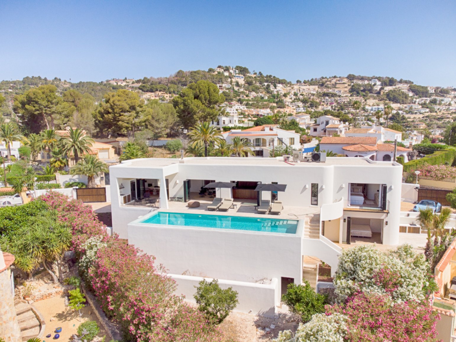 Zuid-georiënteerde villa in San Jaime, Moraira, met uitzicht op zee en de Ifach. Volledig privé, instapklare woning. Kenmerken zijn onder andere een open woonruimte, designkeuken, master suite met zeezicht, twee gasten suites, verwarmd zwembad, BBQ en buitenkeuken. Hoogwaardige afwerkingen door het hele huis.