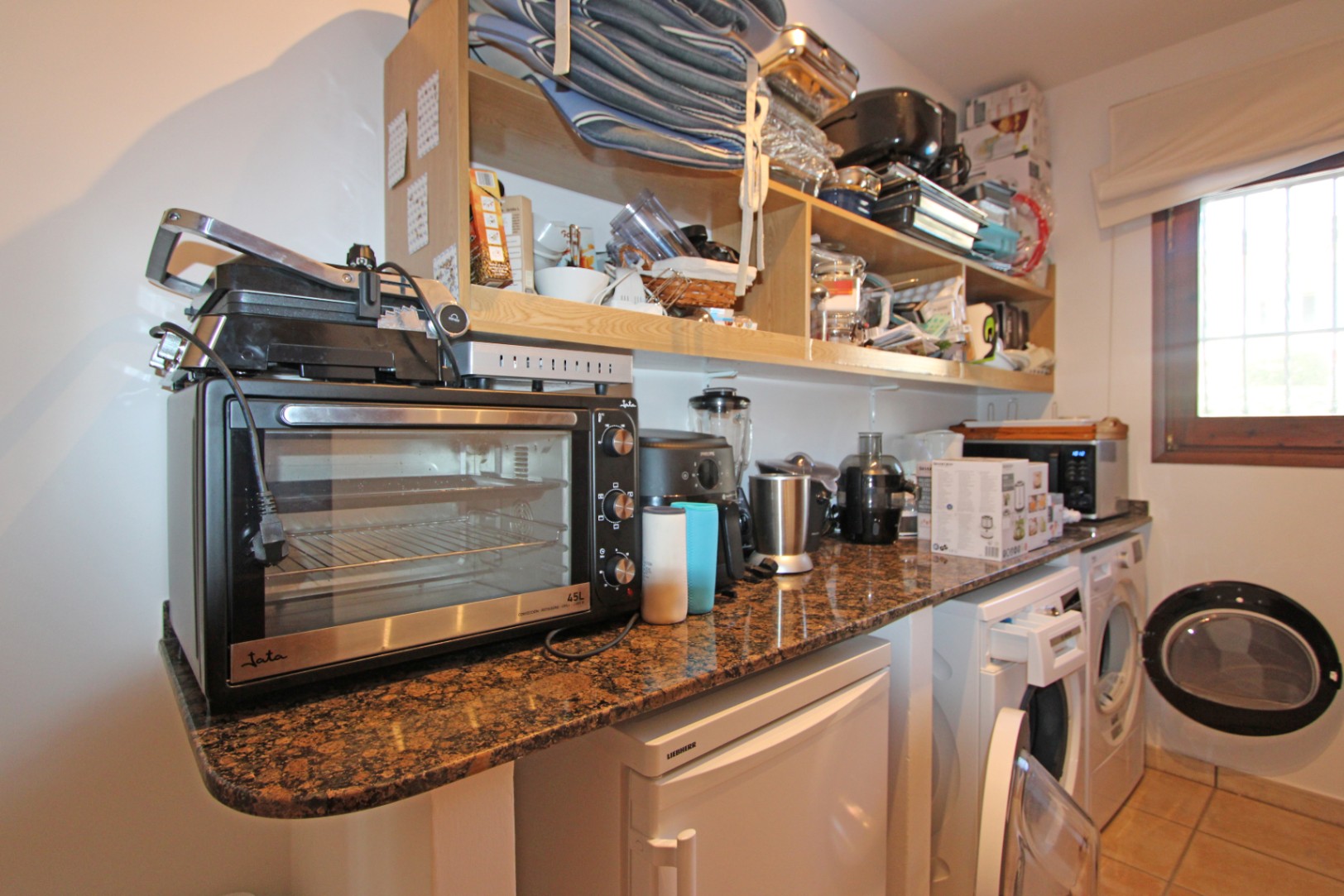 Large 3 bedroom ,2 bathroom villa in immaculate condition only 5 minutes easy walk from the village of Orba. This beautiful property consists of a glazed nyah at the front of the property with views down the Orba valley to the sea. There is a large open plan living room with dining room area and a separate kitchen and utility area with ample storage. There are 3 double bedrooms ,with the master having an ensuite shower room plus a family bathroom. To the rear is an open nyah and an 8x4 pool which is heated, with easy maintenance gardens around the property. The villa also has a large garage with a large storage area . In addition there is off road parking for a further 2 cars. On the lower level is also a room with a sauna which is now used as a gym. It is possible this could be used as 4th bedroom.The property has a complete solar power system complete with solar panels and batteries which provide almost complete independence of electricity supply. There is a split A/C unit in every room, including the garage and gym. In addition there are electric marble radiators, a gas heater in the lounge and a wood burner.This property is on a level plot with a minimum of steps within easy walking distance of Orba. It is found in one of the best maintained urbanisations of the Orba valley and is perfect as a family home as a permanent residence or as a holiday home. Denia is only 20 minutes away with both Alicante and Valencia airports just over 1 hour away. This villa is a great value property and should be seen as soon as possible.