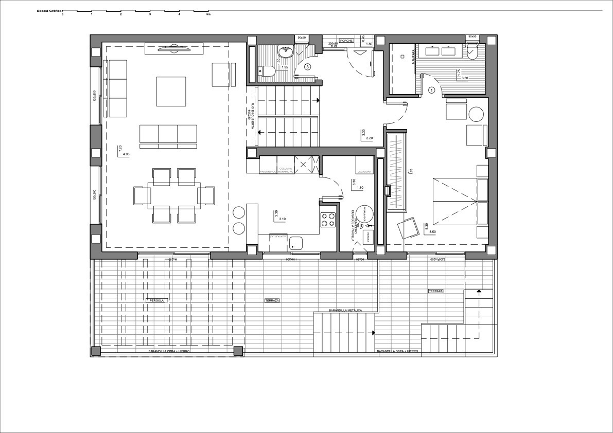 Bij binnenkomst treft u een lichte open woon- en eetruimte met een volledig uitgeruste keuken voorzien van kwaliteitsapparatuur. Grote schuifdeuren geven toegang tot een zonnig terras, ideaal voor ontspanning of diners in de buitenlucht. Op deze verdieping vindt u ook de ruime hoofdslaapkamer met en-suite badkamer en een aparte wasruimte.
