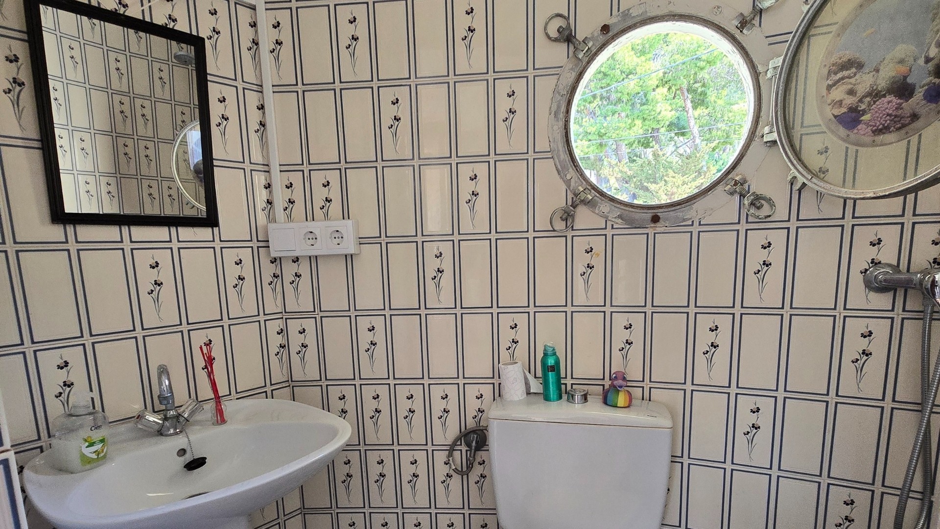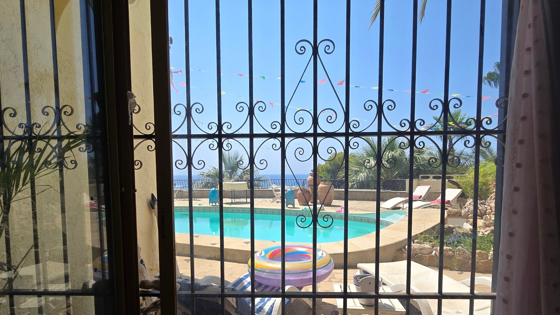 Vanuit de woonkamer daalt u af naar de benedenverdieping, waar zich de hoofdslaapkamer bevindt, compleet met een eigen badkamer, een inloopkast en directe toegang tot het zwembad. Op dezelfde verdieping vindt u ook de zogenaamde zeemanskamer, een charmante lounge met direct uitzicht en toegang tot het zwembadterras. Vanaf hier leidt een trap naar beneden naar een extra gastenappartement met een eigen open keuken, badkamer en aparte slaapkamer. Deze ruimte moet gerenoveerd worden, maar biedt fantastische mogelijkheden als volledig onafhankelijke gastensuite.