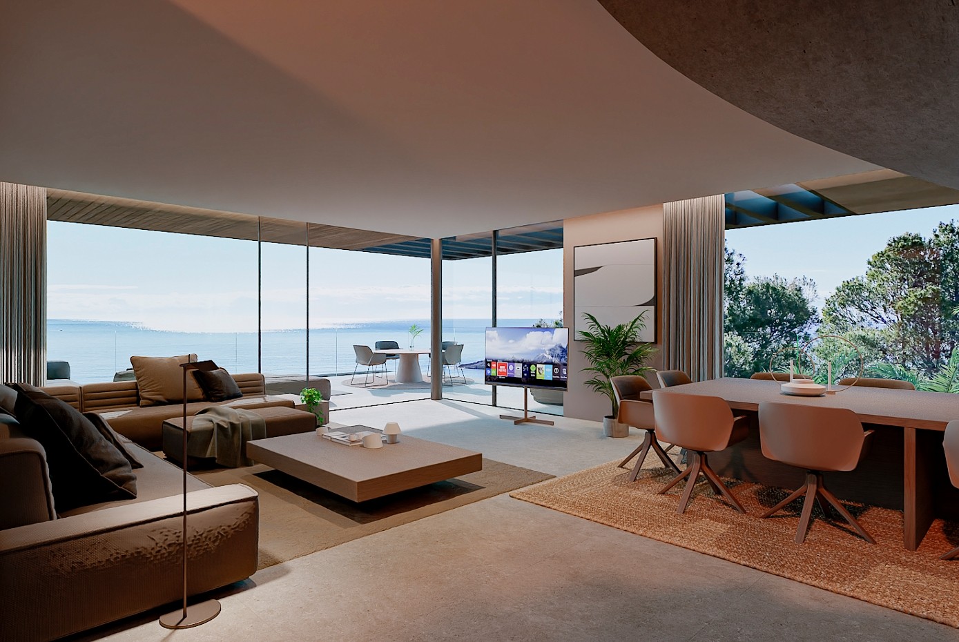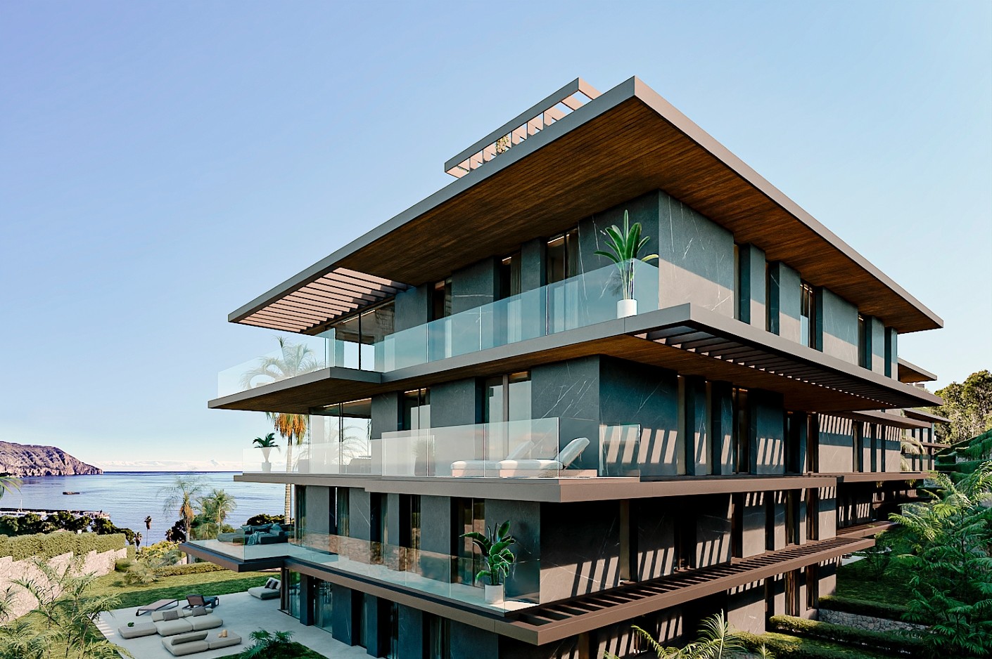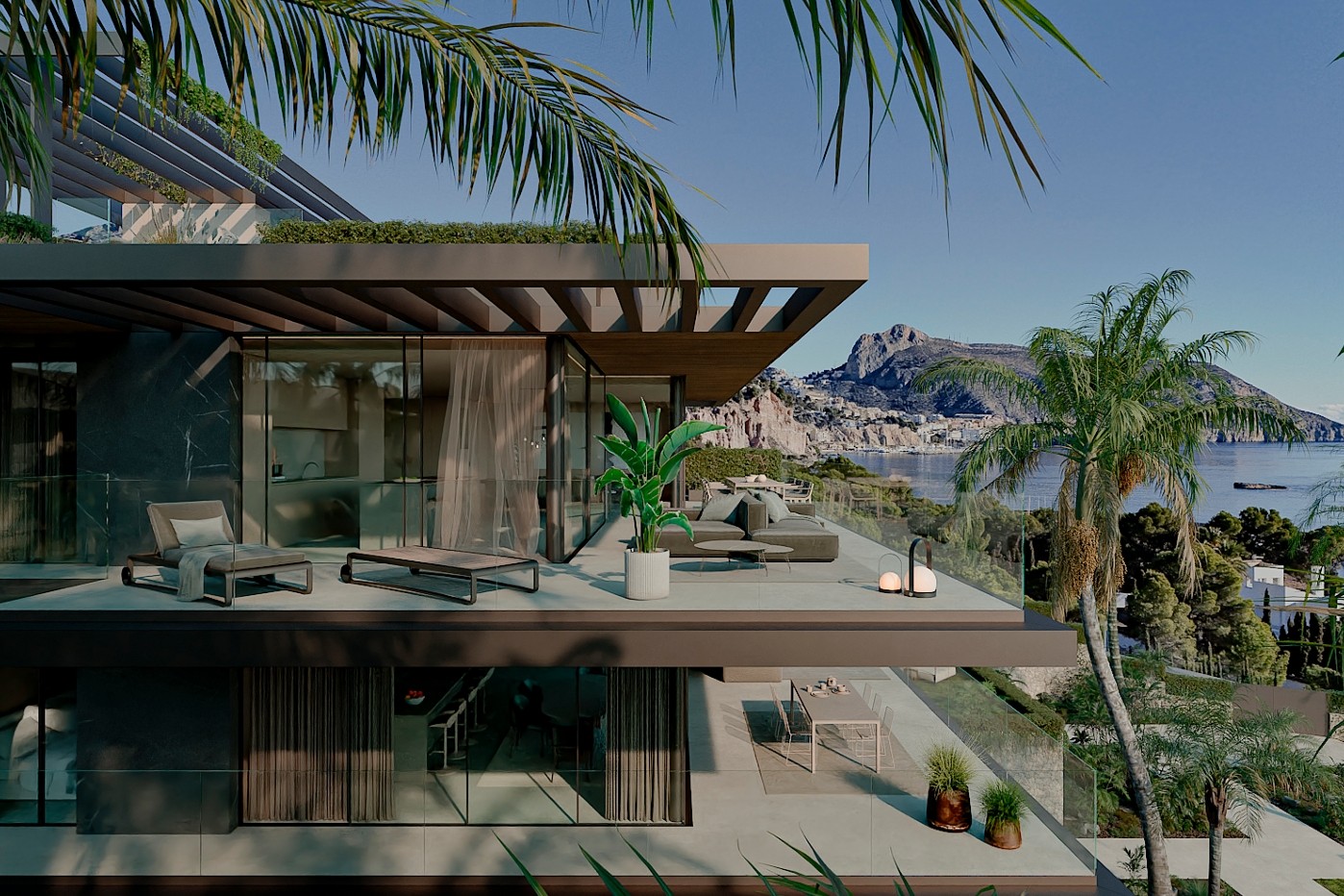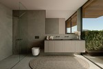 Gebouwd met een solide basis van gewapend beton en hoogwaardig staal, beschikken de woningen over energie-efficiënte gevels van holle keramische blokken met thermische isolatie, geanodiseerd aluminium timmerwerk met thermische onderbrekingen en zonwerende dubbele beglazing met lage E-waarde. Daken zijn ontworpen met dubbele waterdichting en isolatie van polystyreen met hoge dichtheid, afgewerkt met decoratief grind of buitengeveltegels, terwijl de interieurs akoestische minerale wolwanden en slimme huissystemen voor verlichting, jaloezieën en klimaatregeling via luchtwarmtepompen en leidingsystemen voor vloerverwarming bevatten. De gevel combineert keramische bekleding in grote formaten en natuursteen, versterkt met antislip spa-dekking en limoenstenen muren met plantenomrande omheiningen.