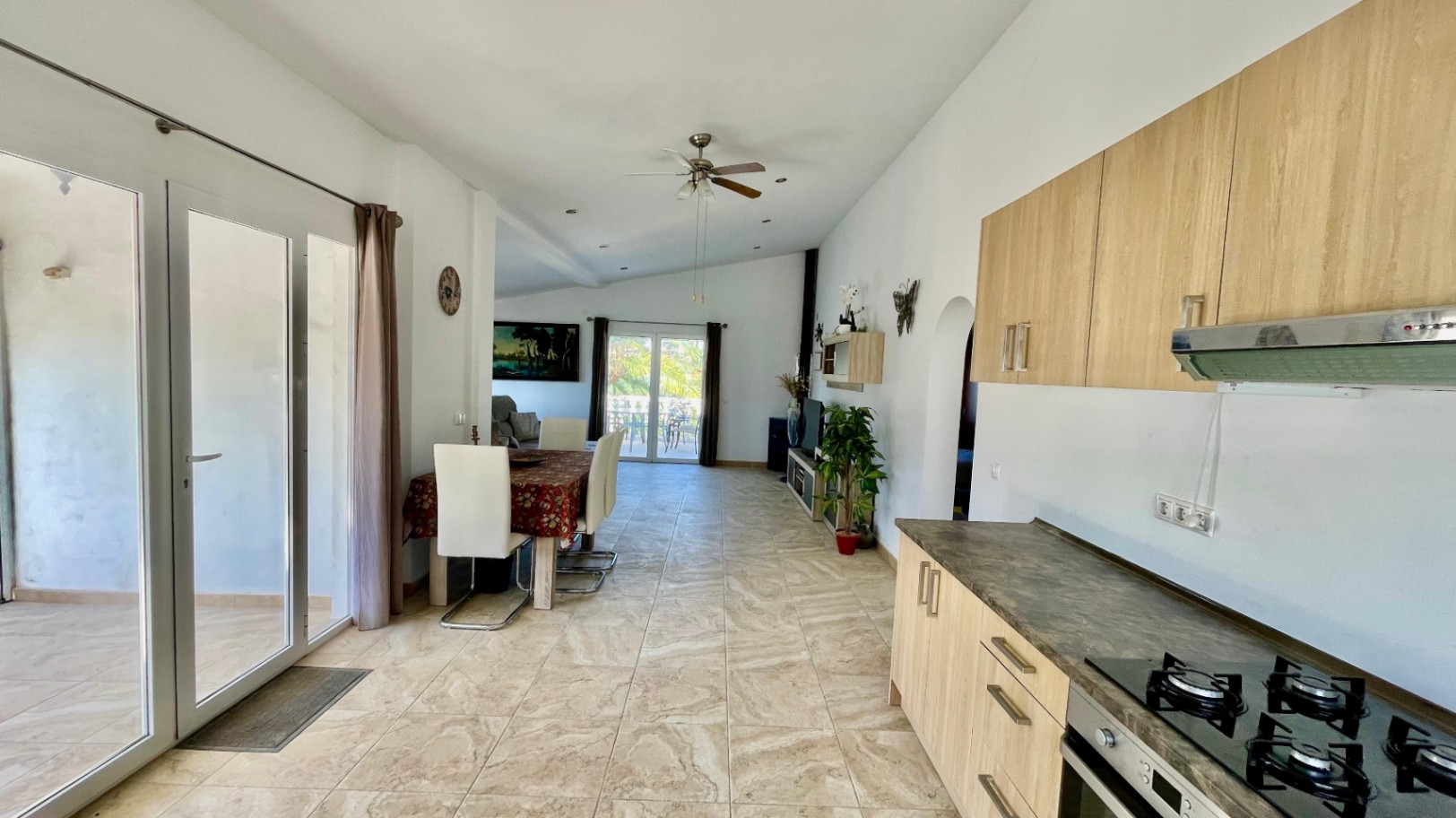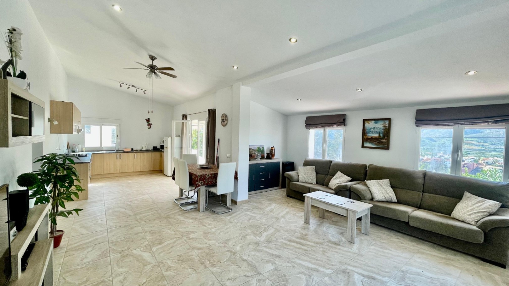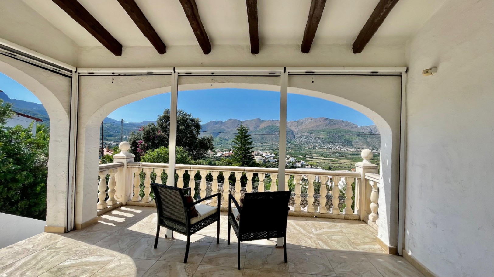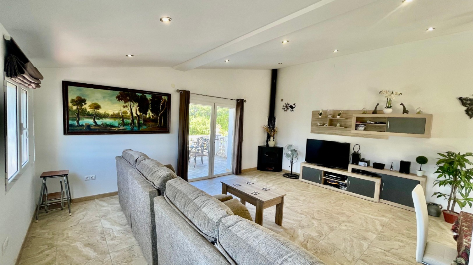 Deze moderne, gerenoveerde vrijstaande villa biedt een fantastisch panoramisch uitzicht over de Orba-vallei en verkeert in uitstekende staat. De hoofdwoning bestaat uit een open overdekte naya met houten balken en openslaande deuren naar een ruime open woon- en eetkamer van 70 m² met hoge plafonds, een vrijstaande hoekhoutkachel, plafondventilator en dubbele openslaande deuren naar een eigen zonneterras en tuin. De grote, open, volledig ingerichte keuken sluit naadloos aan op de woonruimte en creëert een lichte en gezellige omgeving. Een gang leidt naar een royale hoofdslaapkamer met vrijstaande kasten, een slaapkamer met twee eenpersoonsbedden en inbouwkasten, en een moderne familiedouchekamer. Het lagere niveau is ingericht als een groot open appartement met een eigen ingang, bestaande uit een slaapkamersuite, een chill-out kamer, een ensuite inloopdouche en een opbergkast – perfect voor gasten of verhuur. Buiten beschikt de villa over volgroeide mediterrane tuinen, privézonneterrassen die ideaal zijn voor entertainment, en parkeergelegenheid op eigen terrein. De woning is voorzien van nieuwe dubbele beglazing en biedt de mogelijkheid om, met toestemming van het gemeentehuis, een zwembad te bouwen. Deze gemakkelijk bereikbare villa zou een uitstekende permanente woning of vakantiehuis zijn, gelegen dicht bij de lokale voorzieningen van Orba, en een bezichtiging wordt ten zeerste aanbevolen om de rustige, privéligging en het prachtige uitzicht op de vallei ten volle te kunnen waarderen.
