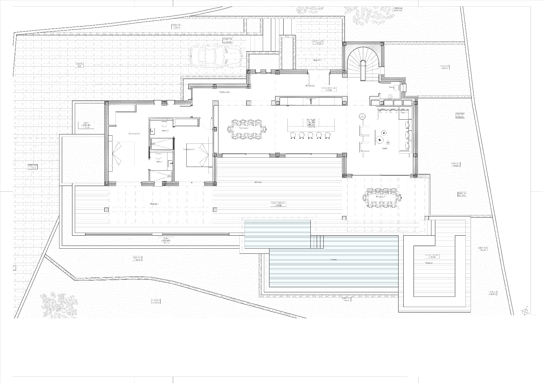 Luxe Ibiza-stijl nieuwbouwwoning in Benissa op een perceel van 1.129 m² met 374 m² bebouwde oppervlakte, panoramisch uitzicht, 4 slaapkamers met en-suite badkamers, kelder met garage, fitness, privébioscoop en wasruimte, ruime living met open woonkeuken, aparte zitkamer, master suite met vestidor, vloerverwarming, airconditioning en hoogwaardige afwerking.
