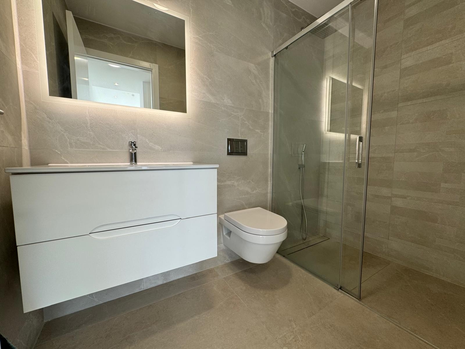 Twee ruime slaapkamers, twee badkamers, een open keuken die naadloos overgaat in de woonkamer en een energiezuinig aerothermisch systeem.