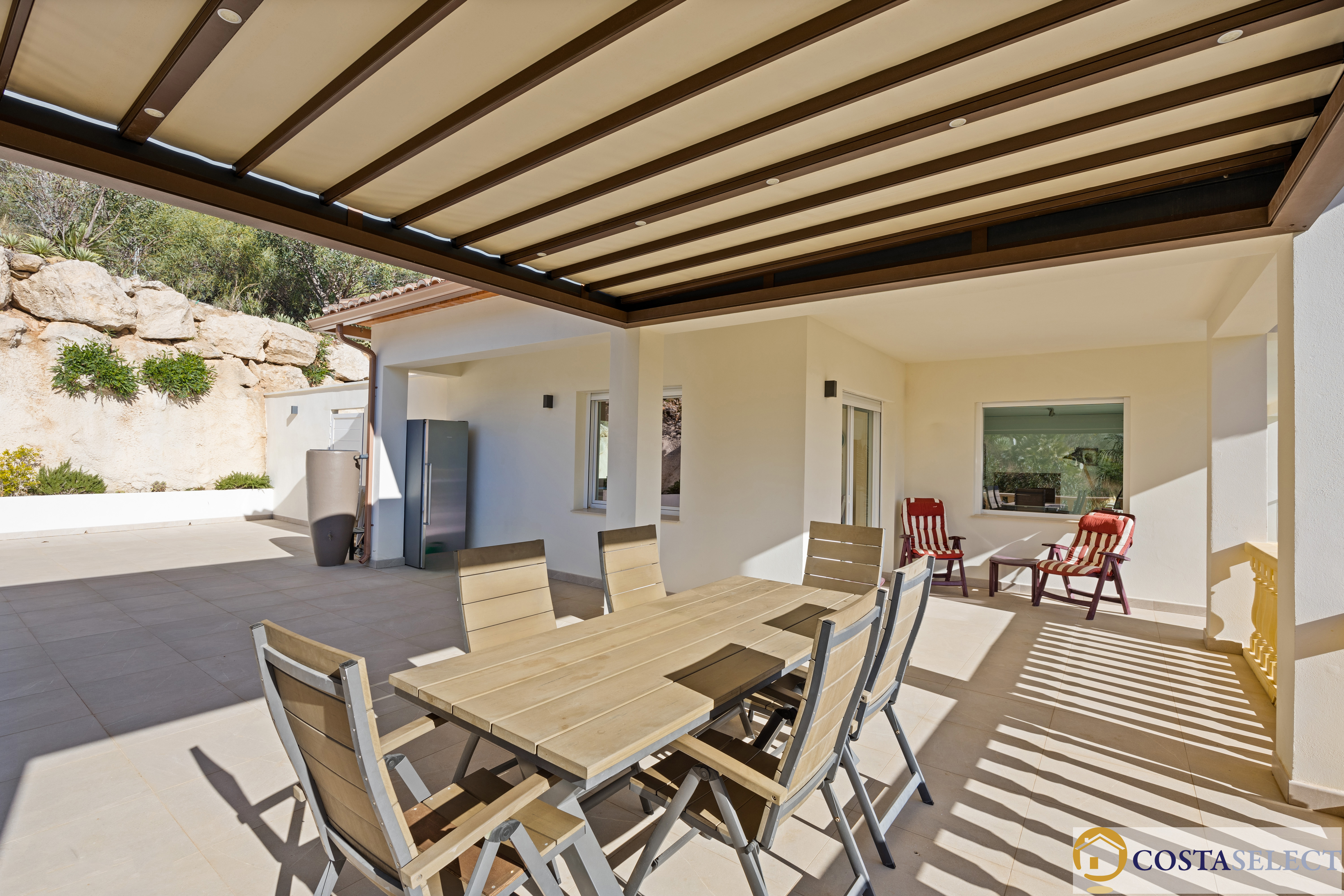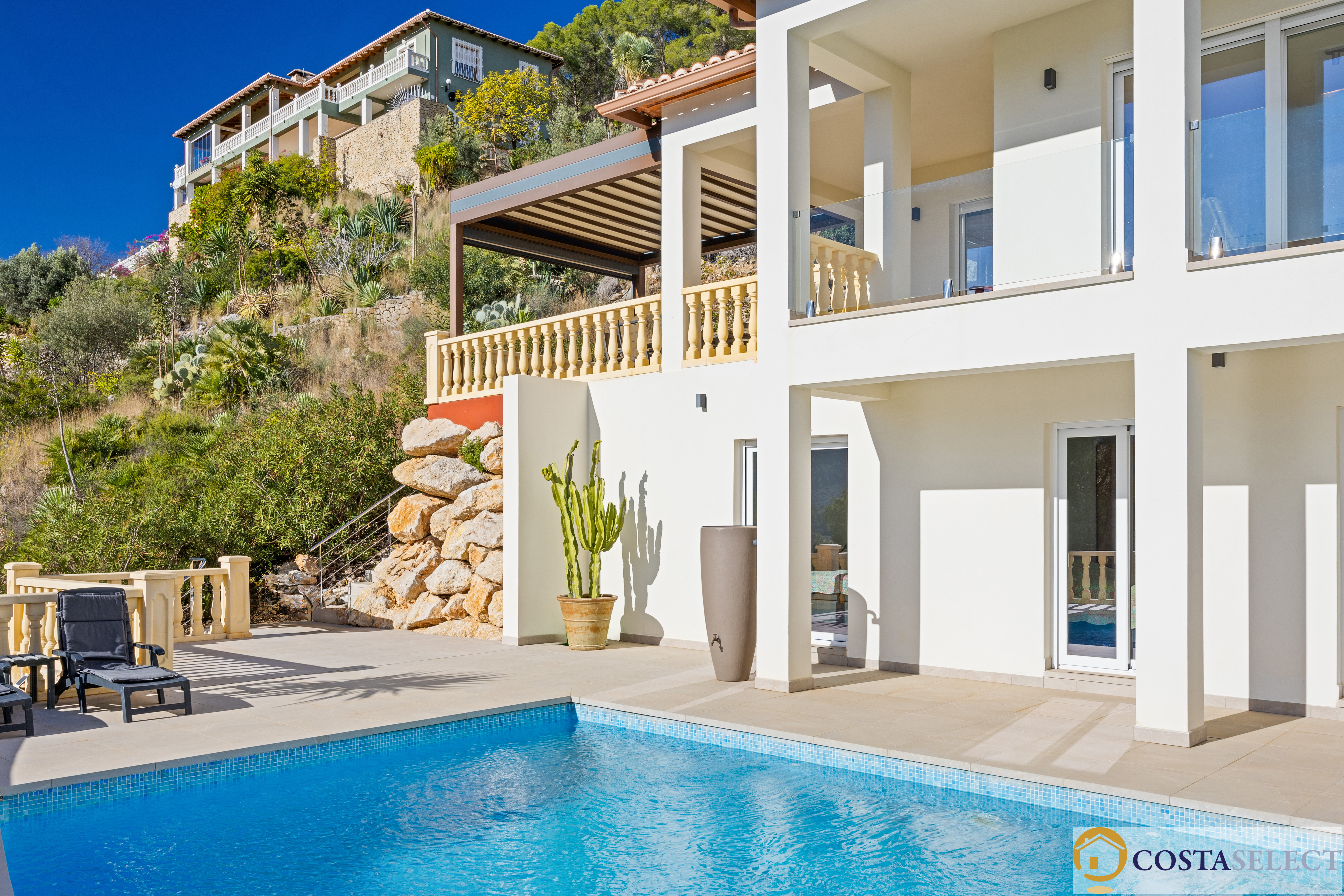 Het buitengebied is ronduit spectaculair: een zwembad van 18 × 6,5 meter, circa 200 m² zonneterrassen, een buitendouche en fraai aangelegde, onderhoudsvriendelijke mediterrane tuinen—alles ontworpen om maximaal te genieten van zon, privacy en uitzicht.