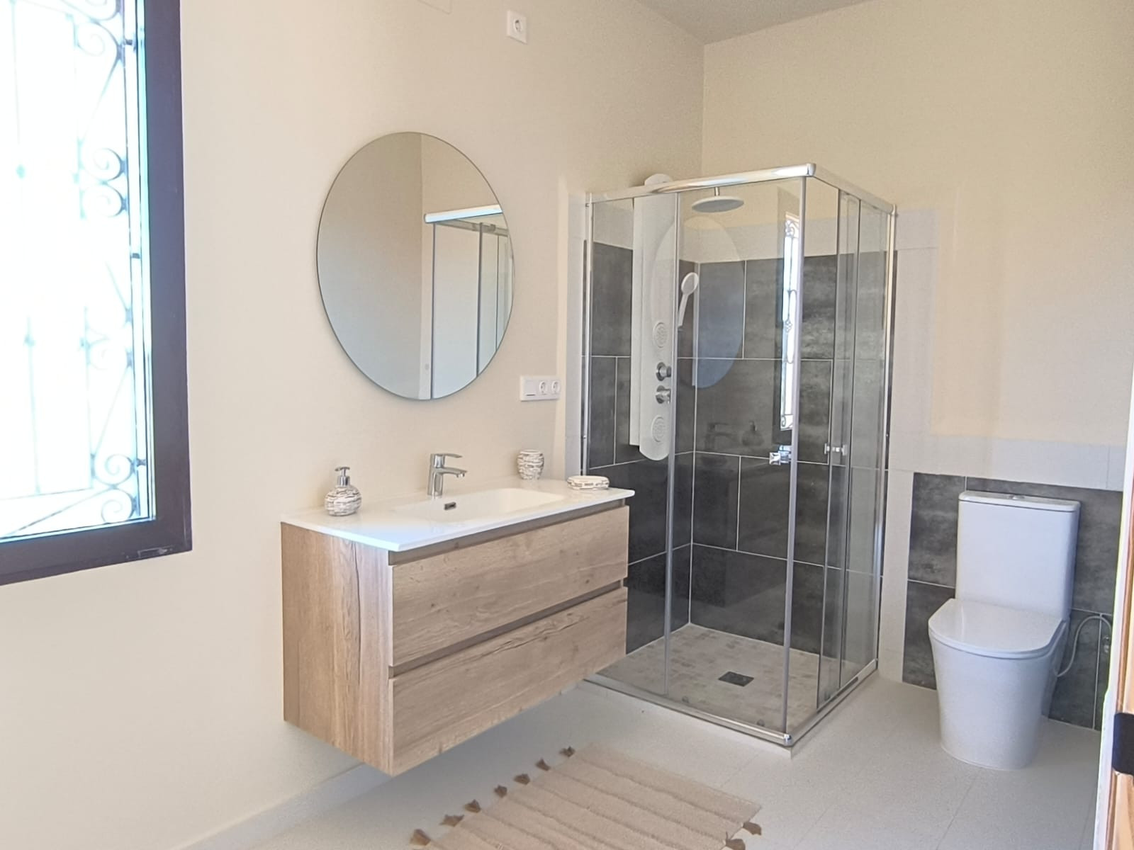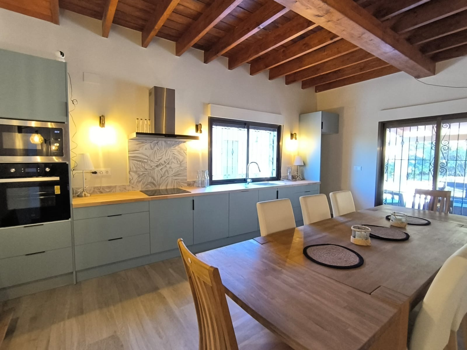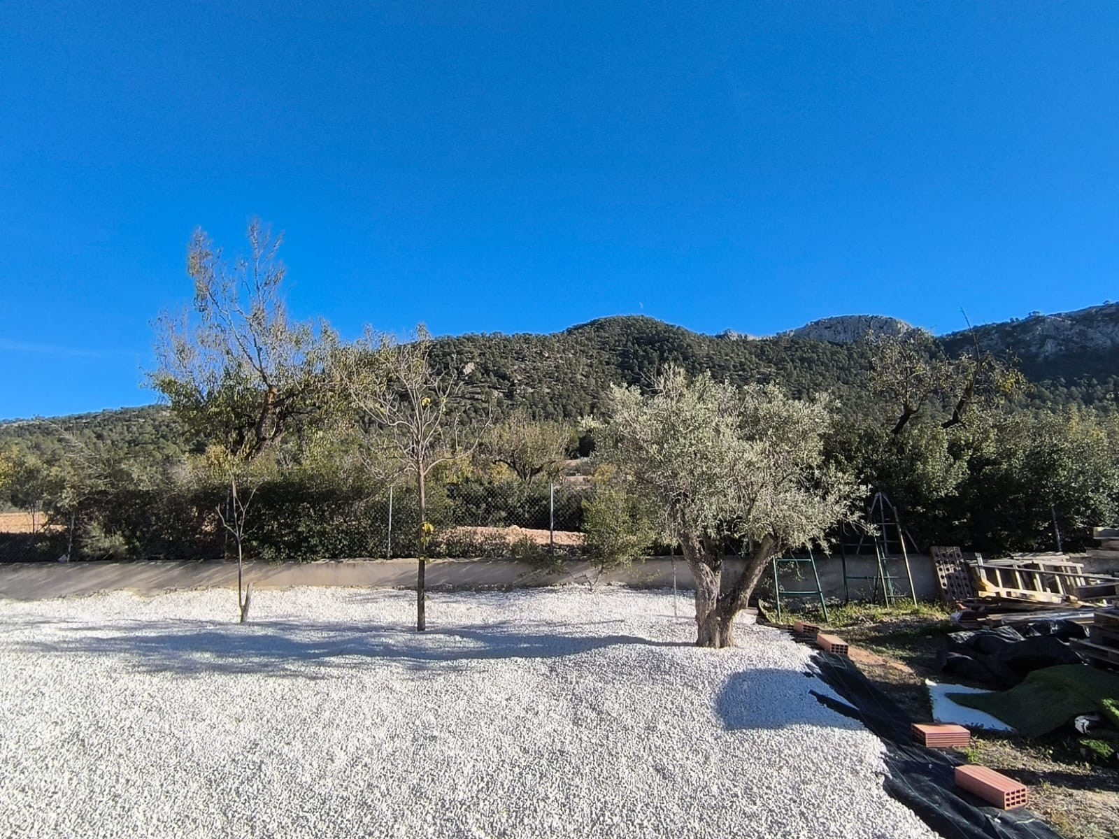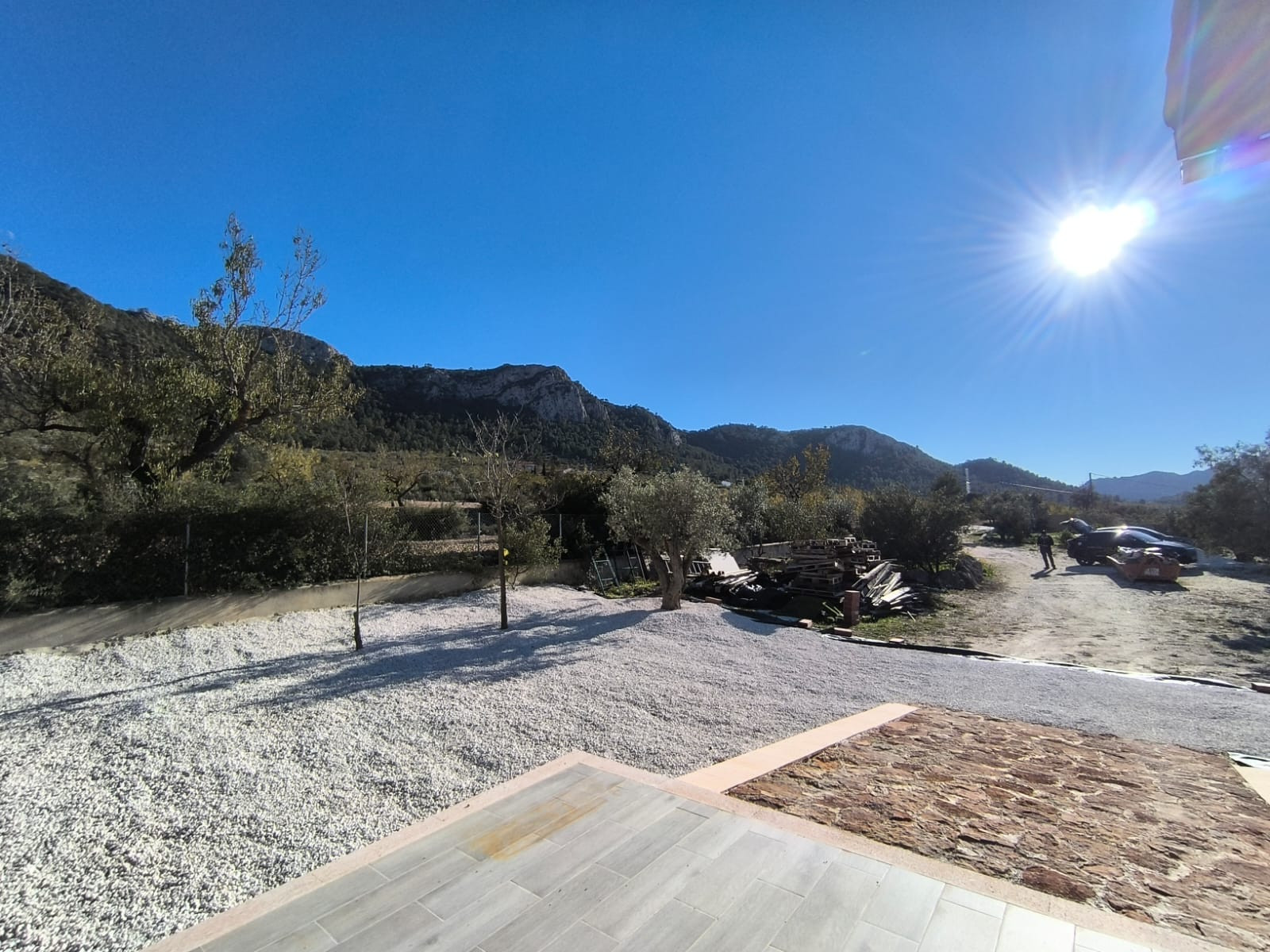 Het hoofdgebouw is doordacht ingedeeld, met een royale hal die de slaapvertrekken van de woonruimtes scheidt. Op de begane grond beschikt de master suite over een inloopkast, een luxe en-suite badkamer en directe toegang tot het terras, zodat u elke ochtend kunt ontwaken met een panoramisch uitzicht op de bergen. De open woonkamer, eetkamer en keuken zijn licht en lopen naadloos over in een groot overdekt terras op het zuiden, ideaal om het hele jaar door buiten te leven en gasten te ontvangen. In het hele huis vormt het uitzicht een constante en opvallende achtergrond.