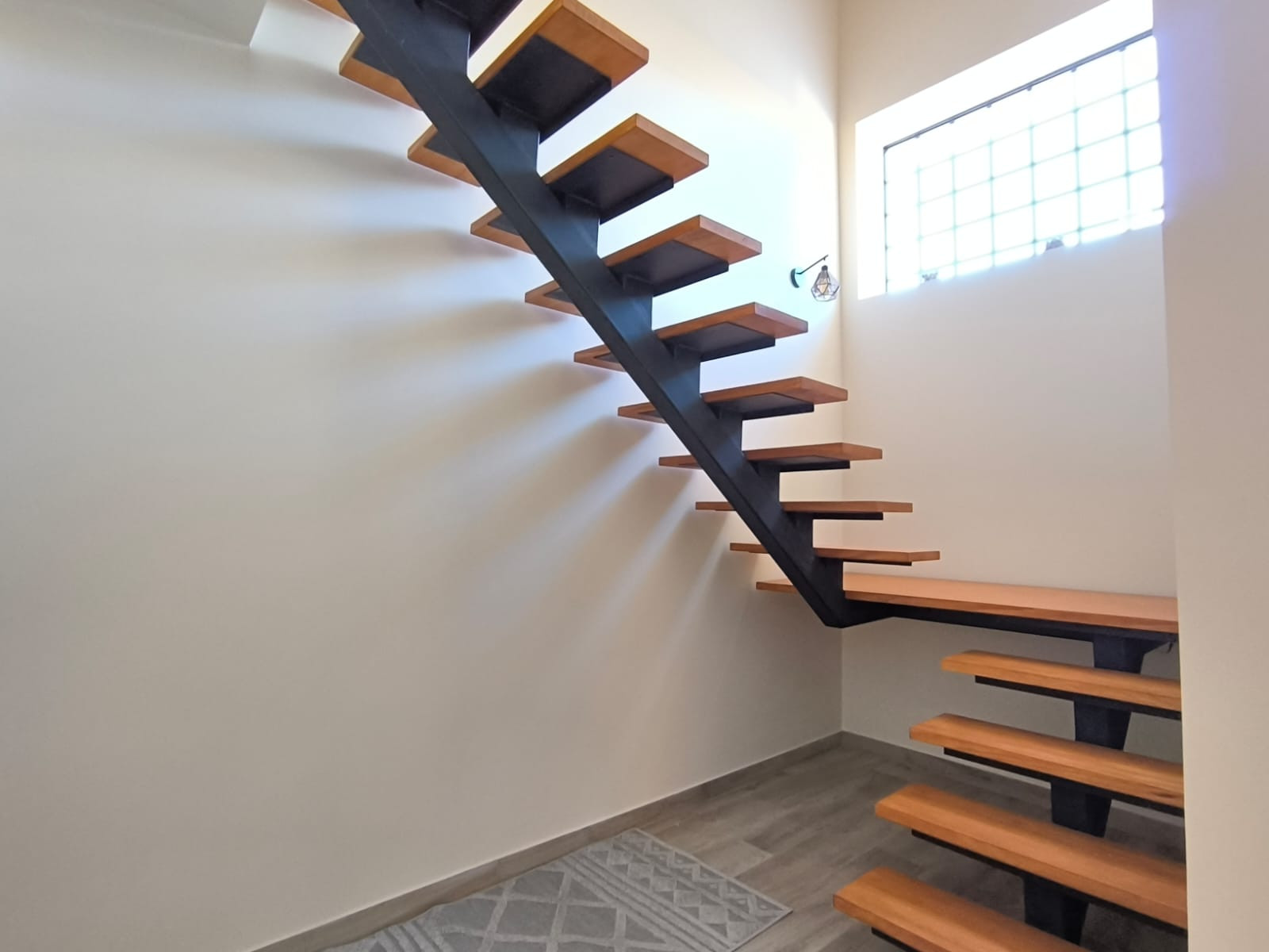Een zwevende trap met geïntegreerde ledverlichting leidt naar de eerste verdieping, waar twee ruime tweepersoonsslaapkamers elk beschikken over een moderne en-suite doucheruimte, die comfort en privacy bieden voor familie of gasten.