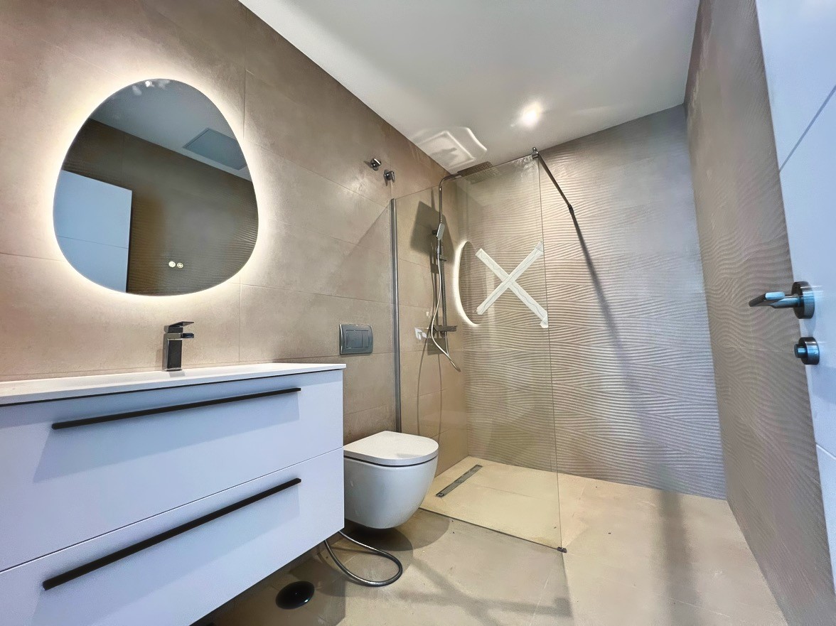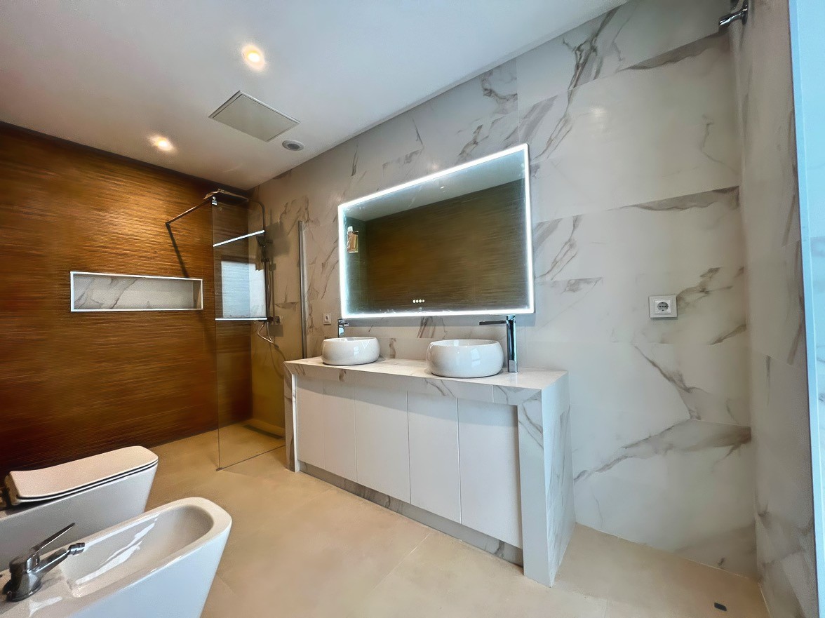 Op de eerste verdieping wachten drie ruime slaapkamers, elk met een eigen badkamer, voor optimale privacy en comfort. Twee privéterrassen bieden rustige plekken om te genieten van het panoramische uitzicht.