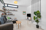 Het interieur is ontworpen met oog voor functionaliteit en comfort. Op de begane grond bevindt zich een ruime, lichte woonkamer met een moderne open keuken. Vanuit zowel de woonkamer als de keuken is er directe toegang tot de privé-tuin – de perfecte plek om te genieten van een ontbijt in de ochtendzon of een diner bij zonsondergang in een ontspannen, mediterrane sfeer. Op deze verdieping bevinden zich ook een gastentoilet en een praktische bijkeuken.