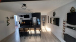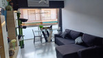 The living room and kitchen are combined into a bright and open space with space for both a lounge area and a dining area. The kitchen is modern and has dark cabinets with good storage options and a dark countertop with generous work surfaces.