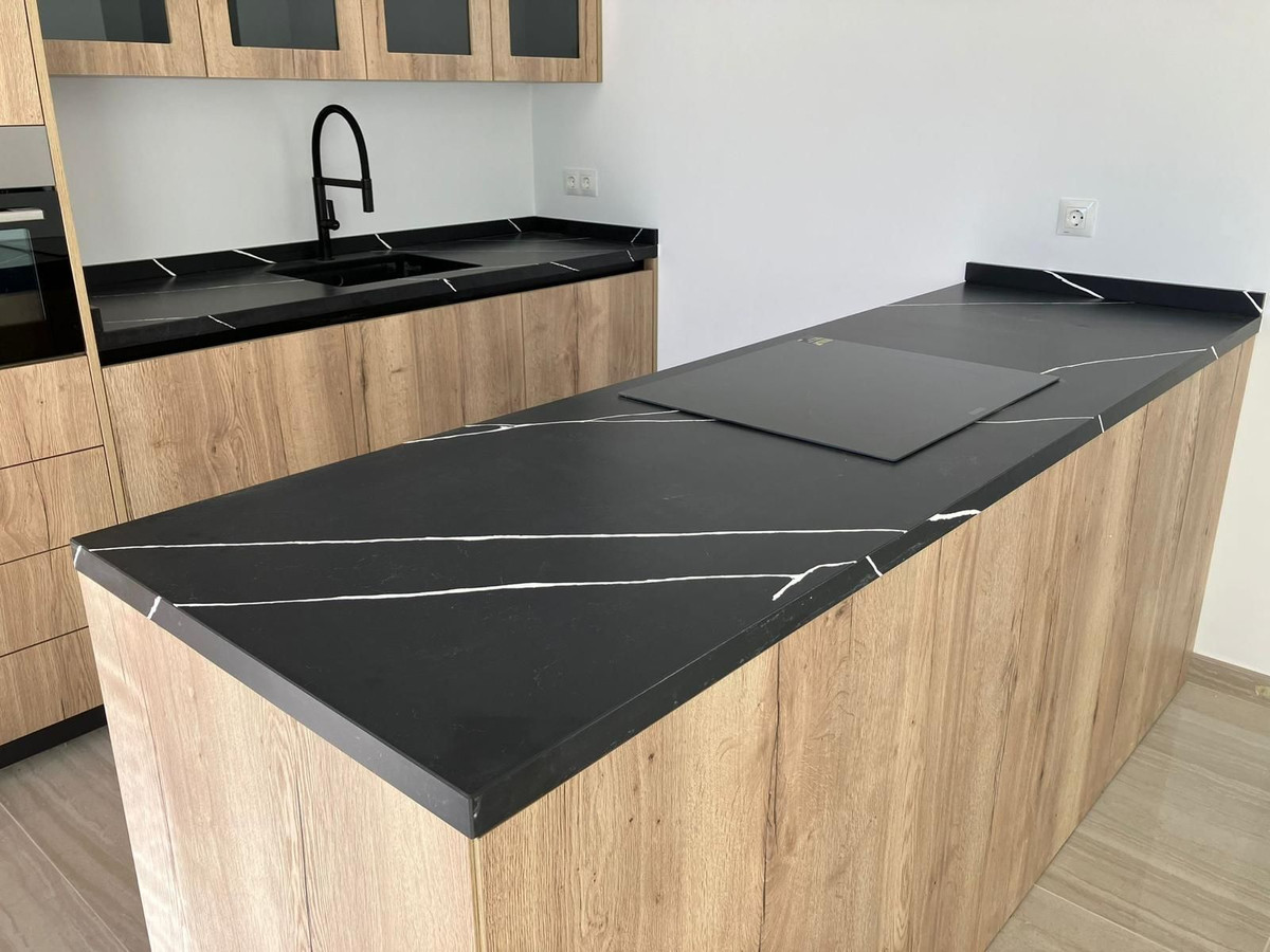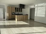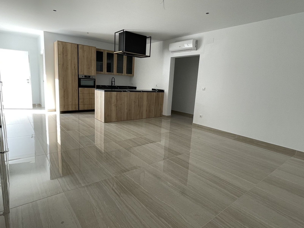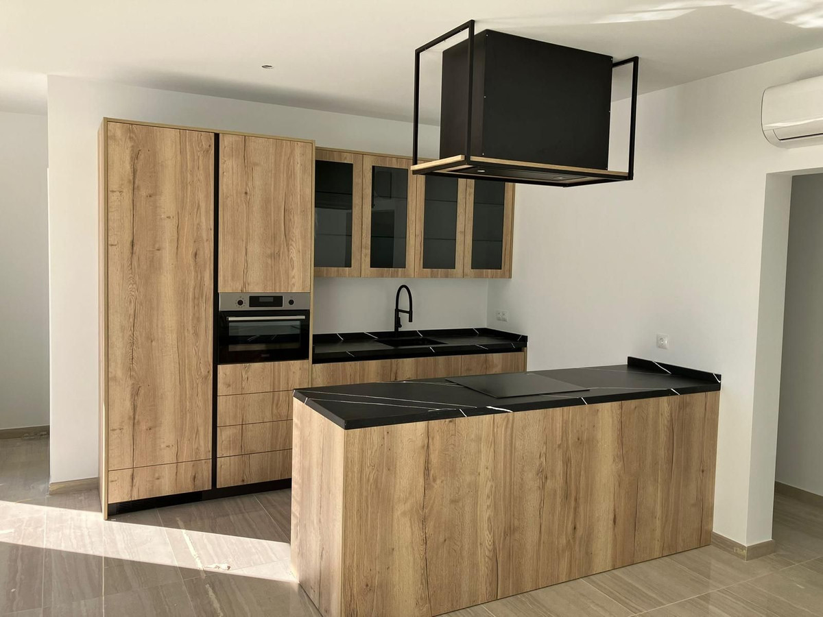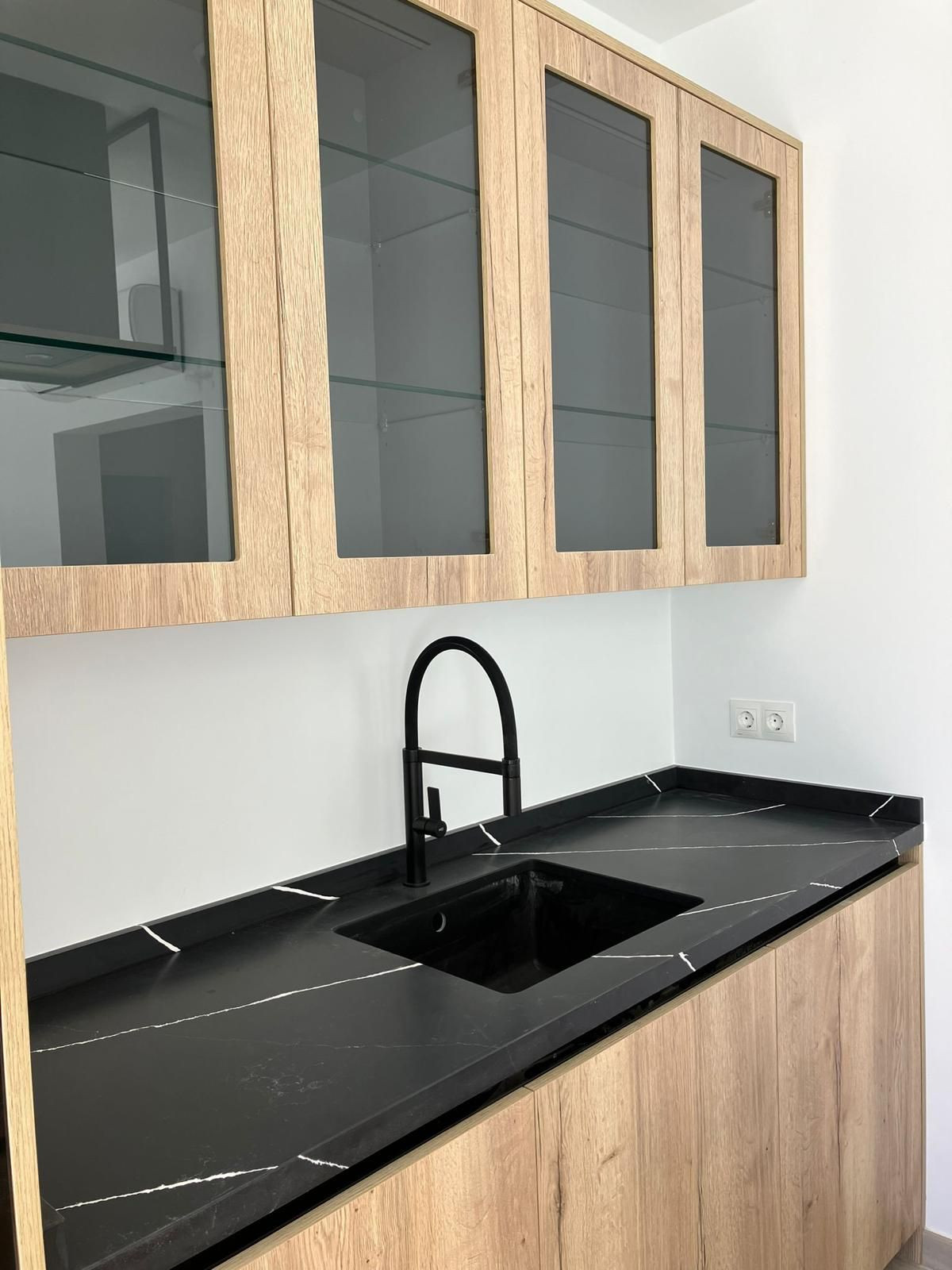 De keuken is uitgerust met oven, inductievuur, dampkap, vaatwasser en koelkast. De openleefruimte bied toegang tot het gastentoilet.