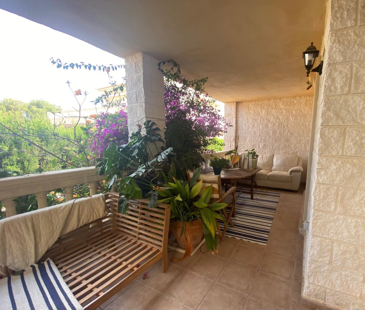 Vanuit de keuken loop je de ruime woon-/eetkamer binnen en de ruime openslaande deuren geven je toegang tot de prachtige, ruime veranda. Via een trapje naar loop je naar de achtertuin, welke je via achterpoort toegang geeft tot het gemeenschappelijke zwembad.