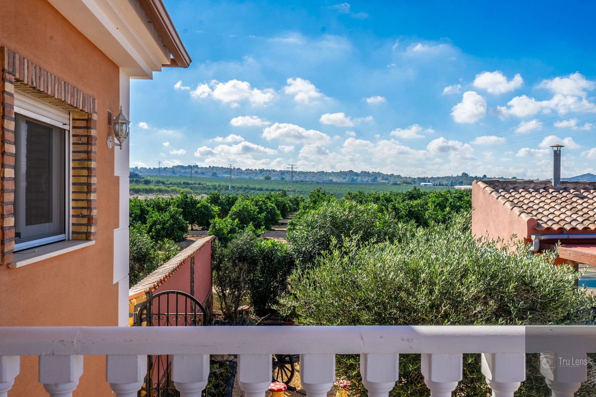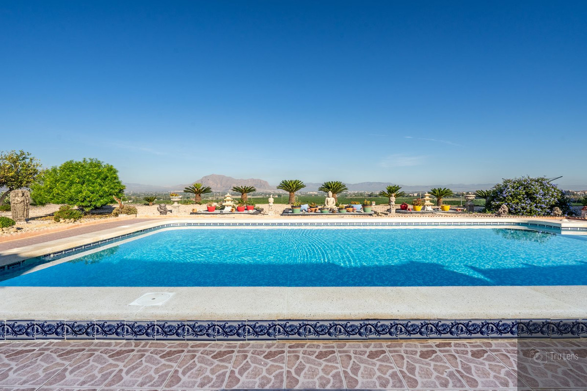 This incredible property, based in a proud elevated position and surrounded by lemon groves, offers an enormous plot of 6490m2, with two homes: a main villa offering three bedrooms and two bathrooms, and a self contained annex of one bedroom and one bathroom. Located in a beautiful and private location yet just 3km to the closest town, the property would make the perfect permanent residence or indeed holiday home. The property is located perfectly between a number of busy villages and towns such as Jacarilla, Bigastro and Algorfa and is just 35 minutes from Alicante airport. Enter the plot via electric security gates into a large driveway with garage for two cars. The main residence is entered from the driveway and its elevated front entrance makes for an impressive start to the home. Through the front door can be accessed the ample living, dining and fully refurbished kitchen, with views of the mountains, lemon groves and pool from every window. To the right of the property is a master bedroom with private ensuite, and to the left are two further bigger than double bedrooms and a family bathroom. The kitchen is fully equipped and also enjoys access to a pantry. Access to the pool area is via patio doors directly from the dining room, from here there is an elevated patio and stairs down to the gardens and pool. The separate annex, which can be accessed completely separately offers a large master, living room, fully equipped kitchen and large family bathroom. It enjoys incredible views thanks to its uninterrupted glass patio doors which look over the pool and mountains to the distance. The outdoor space is almost endless and has been incredibly well maintained, offering both sunny and shady spaces to dine, sunbathe, exercise and socialise. The spaces are complemented by mature plants and fruit trees. The saltwater pool, measuring 10 x 5, sits proudly in the centre of the main garden. There is an additional plot, currently used as an orchard, which offers more possibilities to construct further living space, workspace or to expand the current gardens. The property also enjoys an underbuild which is currently used as a workshop and gym. Both properties offer central heating and air conditioning throughout. They also enjoy use of solar panels, which produce an excess of energy to run both properties, meaning that the only cost for electricity is connection of approximately 30 euros per month. The property can be sold completely furnished, as seen, by further negotiation. - Large Plot - Private but Accessible Location - Main Residence - Annex - Completely Refurbished - Solar Panels - Private Pool - Possibilities to Further Expand