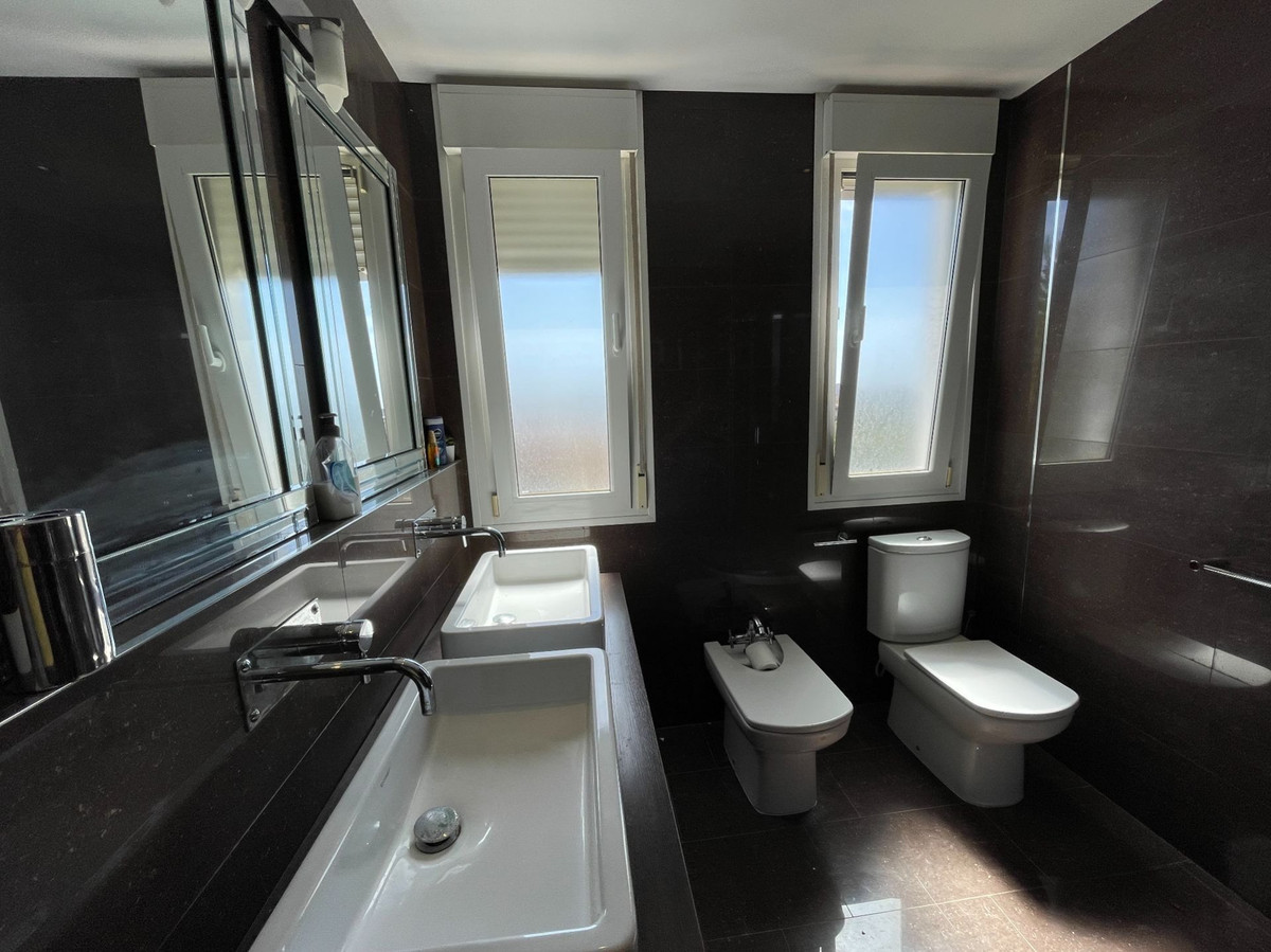Upstairs are two further double bedrooms to the front, both with wardrobes, air conditioning and patio doors opening out onto small balconies with fantastic views. There is a small seating area under the atrium between the bedrooms and a family bathroom and family shower room on either side. To the rear is a second master suite with ensuite shower room with twin sink, WC and bidet. This room has the benefit of a good size balcony with views to the rear and side.