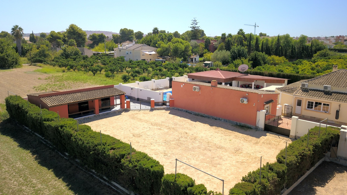 Deze werkelijk wenselijke, op het oosten en westen gelegen, vrijstaande villa met vier/zes slaapkamers, stallen en weiland op een perceel van 2000 m² in Las Heredades, tussen Formentera del Segura en Almoradi, ligt in een pittoreske omgeving op slechts 6-7 minuten lopen van het charmante Spaanse dorp en op slechts 5 minuten rijden van Formentera del Segura, Rojales en Benijofar. De prachtige stranden en de populaire promenade van Guardamar liggen op slechts 15 minuten rijden. De hoofdvilla beschikt over 4 slaapkamers en 3 badkamers plus 1 garderobe. Een van de slaapkamers wordt momenteel gebruikt als golfsimulatorruimte, terwijl de hoofdslaapkamer beschikt over een inloopkast en een prachtige en suite met zowel een bad als een douche. Twee van de overige slaapkamers hebben ook een en suite badkamer. De villa beschikt over een fantastische moderne keuken in landelijke stijl met geweldige deuren die vanuit de eetkamer naar een buitenterras leiden dat uitkijkt op het privézwembad. Het buitengedeelte is perfect voor entertainment met een buitenkeuken, barbecue en entertainmentruimte. Aparte gastenaccommodatie biedt nog eens 2 slaapkamers, een natte ruimte, keuken en woonkamer, waardoor het perfect is voor bezoekers of een uitgebreide familie. Het pand omvat stallen en een paddock, een kantoor in de woonkamer van de hoofdvilla, airconditioning overal, verwarmingspanelen, inbouwkasten en een aparte bijkeuken. De buitenruimte heeft prachtige tegels rond het zwembad, voldoende off-road parkeergelegenheid onder de carport en een fontein. Deze villa combineert op meesterlijke wijze moderne en traditionele kenmerken, waardoor het een echt uniek en gewild huis is in Costa Blanca South.