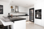 The ground floor has an open plan kitchen and living area that flows naturally out to the south-facing terrace, ideal for everyday living and social gatherings. A guest bathroom is also located on this level.