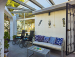Aan één kant van het huis is er een afgeschermde eethoek met betegelde moderne bankjes en een eettafel van rookglas,