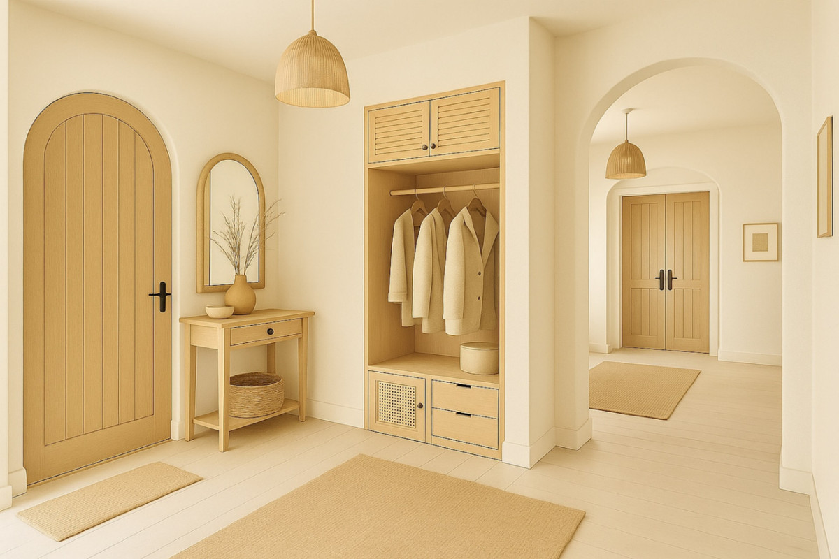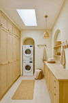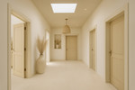 De woning is ontworpen zonder trappen en biedt een doordachte indeling die comfort en privacy garandeert. Bij het betreden van de villa komt u in een elegante inkomhal met praktische vestiairekast. De ruime leefruimte baadt in het licht en vormt één open geheel waarin woonkamer, eetkamer en keuken naadloos in elkaar overvloeien. Grote ramen geven directe toegang tot het zonneterras met houten overkapping, de aangelegde tuin en het zwembad. Naast de woonkamer is er een ruimte met wasmachine, droogkast en ingemaakte kastenwand.