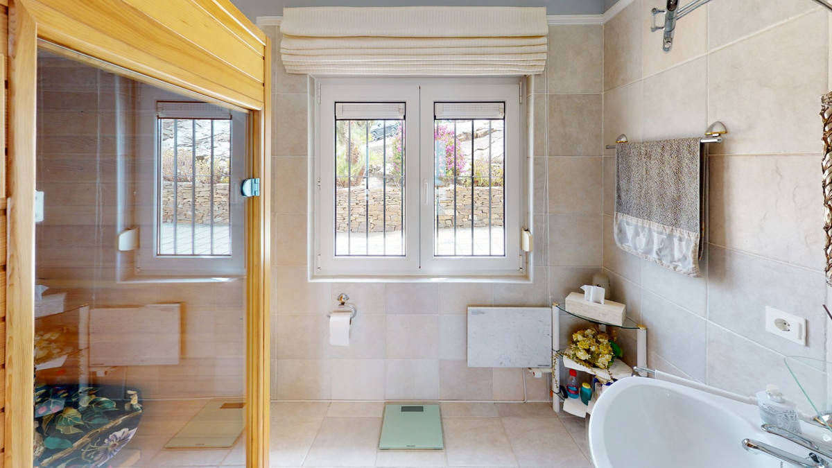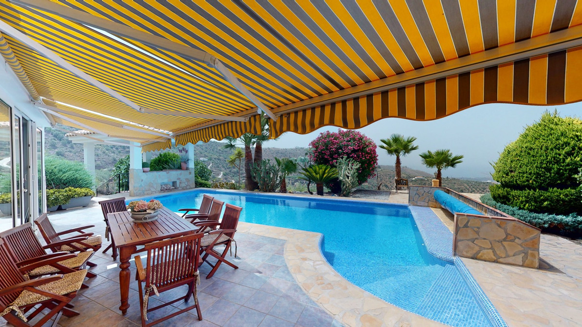 Als het je droom is om in een fantastische, hoogwaardige gebouwde villa te leven met een zwembad en adembenemend uitzicht op de middellandse zee, dan heb je de juiste woning gevonden. Deze 280 m2 luxe villa biedt alles wat je maar zou kunnen willen. In het midden van de moderne villa is gemengd met Andalusische stijl een charmante patio, die het huis een speciaal accent geeft en een prachtige verlichting en sfeer biedt. Het verbindt het hele onderste deel van het pand. Vanaf de ingang leidt één kant naar een kamer die wordt gebruikt als kantoor, evenals een slaapkamer met een badkamer op de suite en de ruime woonkamer met een open haard en uitzicht op de middellandse zee. Dit grenst op zijn beurt aan de eetkamer en de keuken, waaruit u de gang binnenkomt die is verbonden met de ingang. Deze gang leidt ook naar de kleedkamer met een badkamer ensuite, waar een sauna is. Trappen leiden vanaf de ingang naar de tweede verdieping. Hier vindt u de grote hoofdslaapkamer met een badkamer en een wintertuin. Externe trappen leiden naar de buitenruimte, die deze kamer een aparte ingang geeft. De prachtige buitenruimte biedt een dubbele garage, evenals een wasruimte, die ook wordt gebruikt voor opslag. Direct naast het uitnodigende zwembad ligt een sportlokaal met een badkamer, evenals een bijgebouw met een glazen front die dient als een lounge met een buitenkeuken. De perfecte plek voor feesten en diners met familie en vrienden. Op het terrein van 19.500 m22 is er ook een paddock, met onderdak en zijn eigen oprit voor het houden van paarden. Het is gelegen onder het huis. De oprit leidt ook naar een kleine rijarena met drie paardenstallen, een voorraadkamer en een douche voor de paarden. U hebt veel ontwerpmogelijkheden van het ruime pand. Of het nu is om een fruit- en groentetuin te planten, het gebied van de paarden uit te breiden, de rijarena mogelijk om te zetten in een tennisbaan, volleybal of klein voetbalveld, zelfs iets volledig nieuws. De keuze is helemaal aan jou. We zijn blij dat we dit droomhuis binnenkort aan u mogen voorstellen, hetzij persoonlijk, hetzij via een virtuele bezichtiging. Want deze wereld is uniek – net als onze Axarquía. In Andalusië. Aan de Costa del Sol. Hier, aan de zonnige kant van het leven…