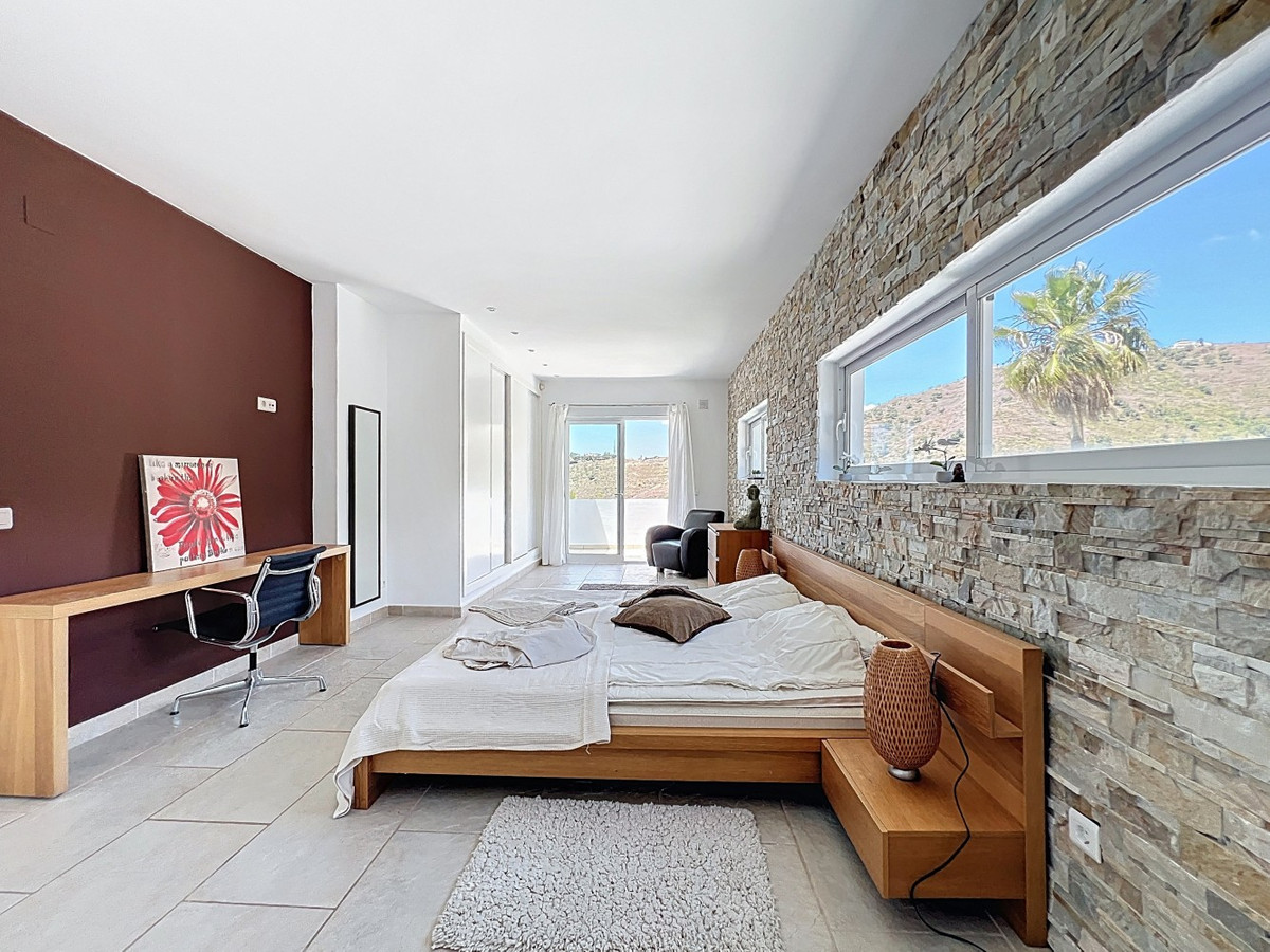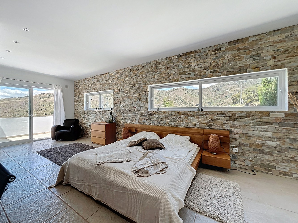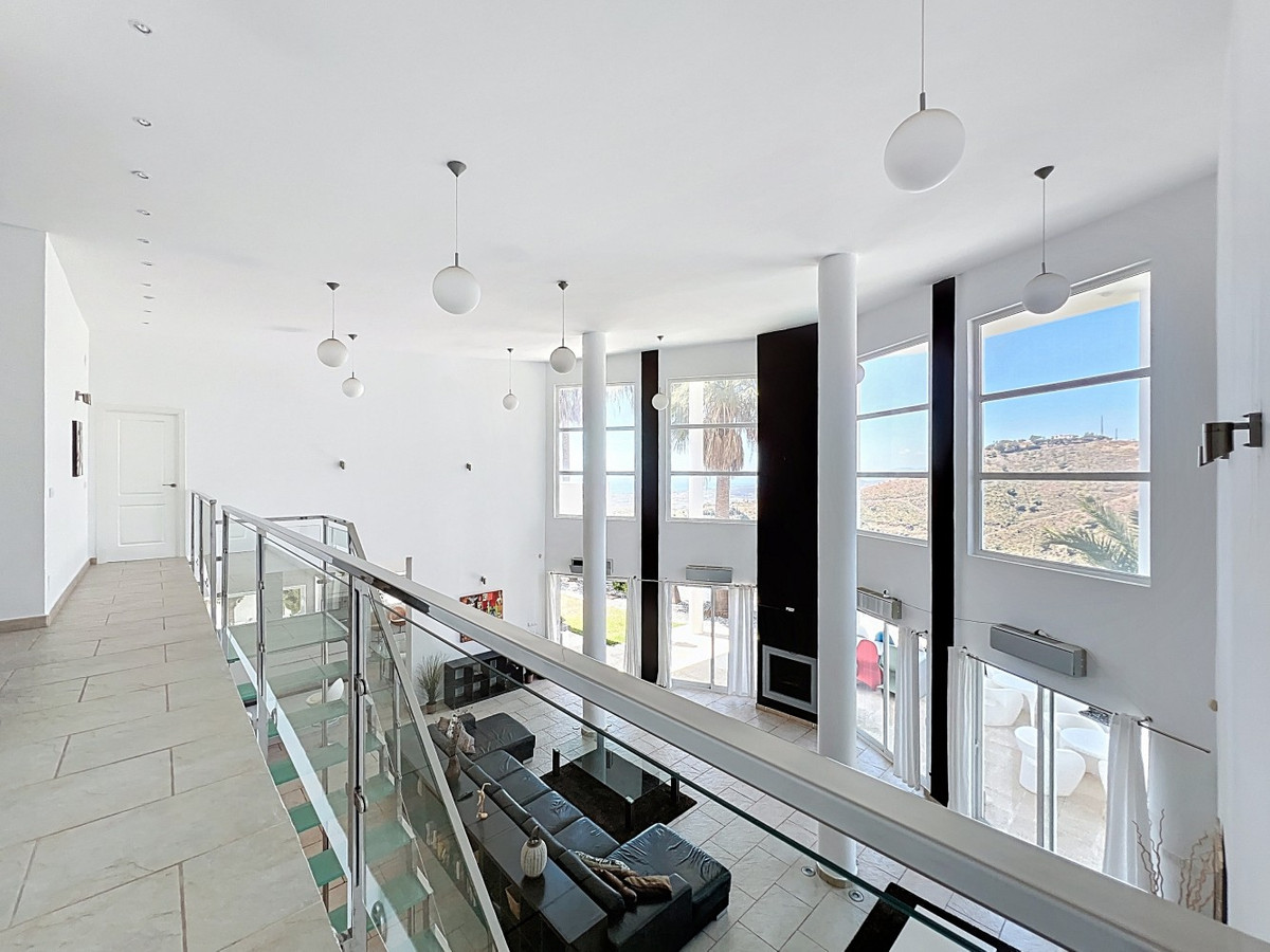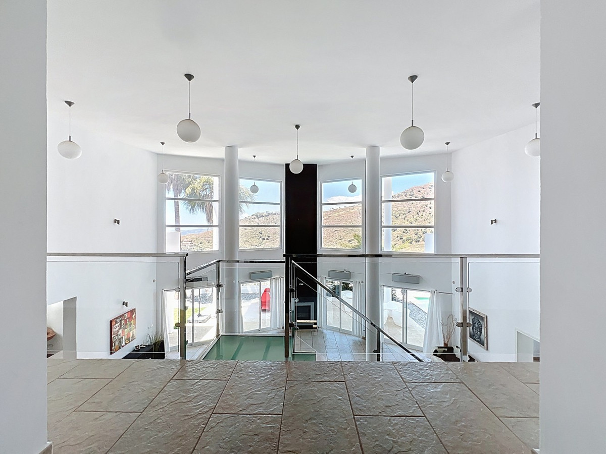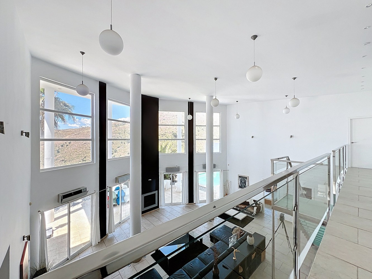 Deze indrukwekkende villa in Málaga, Spanje, biedt een harmonieuze mix van ruimte, luxe en modern design. Het pand beslaat 395,8 m2 verdeeld over twee verdiepingen en beschikt over 7 slaapkamers en 5 badkamers, wat het ideaal maakt voor grote gezinnen of mensen die graag gasten ontvangen. De begane grond, met een oppervlakte van 212,7 m2, heeft een adembenemende open woonruimte met hoge plafonds. Van vloer tot plafond geplaatste ramen en schuifdeuren vullen de ruimte met natuurlijk licht en bieden naadloos binnen- en buitenleven. De woonkamer wordt gekarakteriseerd door een strakke open haard en wordt aangevuld met comfortabele, moderne meubels. De state-of-the-art keuken is een droom voor elke chef-kok en biedt glanzende witte kasten, hoogwaardige apparaten en een royaal eiland met zitplaatsen aan de bar. Grote ramen bieden een prachtig uitzicht op het omliggende landschap terwijl je maaltijden bereidt. Een uniek kenmerk van de begane grond is de indoor zen-tuin, compleet met zand en decoratieve planten, die een rustgevende sfeer toevoegt aan de ruimte. De hallen zijn breed en goed verlicht, met zorgvuldig gekozen kunstwerken aan de muren. Via een moderne trap met glazen leuningen kom je op de tweede verdieping, die 183,0 m2 extra woonruimte biedt. De hoofdslaapkamer van 26,9 m2 biedt een prachtig uitzicht en een en-suite badkamer. De badkamers door het hele pand zijn stijlvol en modern, met grote tegels, inloopdouches en hedendaagse armaturen. Sommige badkamers hebben unieke ontwerpelementen, zoals douchgordijnen met een krantenprint, die een speelse touch toevoegen aan het anders minimalistische ontwerp. Buiten profiteert het pand van zijn verhoogde positie, met panoramisch uitzicht op de omliggende bergen, het platteland en de glinsterende Middellandse Zee. De buitenruimte heeft een groot zwembad, perfect om te ontspannen of te entertainen terwijl je geniet van het adembenemende uitzicht. Het pand biedt goede toegang en zorgt voor een gemakkelijke verbinding met nabijgelegen voorzieningen en attracties. Grote terrassen bieden voldoende ruimte voor buiten ontspanning en entertainment, waardoor deze villa de ideale plek is om in stijl van het Spaanse klimaat te genieten. Het kleurenschema van de villa is overwegend wit, wat een lichte, luchtige sfeer creëert die perfect past bij het Spaanse klimaat. Kleurrijke accenten in meubels en kunstwerken zorgen voor visuele interesse zonder de serene sfeer te verstoren. Deze villa is de belichaming van modern Spaans wonen, met ruime interieurs, hoogwaardige afwerkingen en adembenemende uitzichten, alles samengebracht in een indrukwekkend geheel een waar droomhuis. We zijn blij dat we dit droomhuis binnenkort aan u mogen voorstellen, hetzij persoonlijk, hetzij via een virtuele bezichtiging. Want deze wereld is uniek – net als onze Axarquía. In Andalusië. Aan de Costa del Sol. Hier, aan de zonnige kant van het leven…