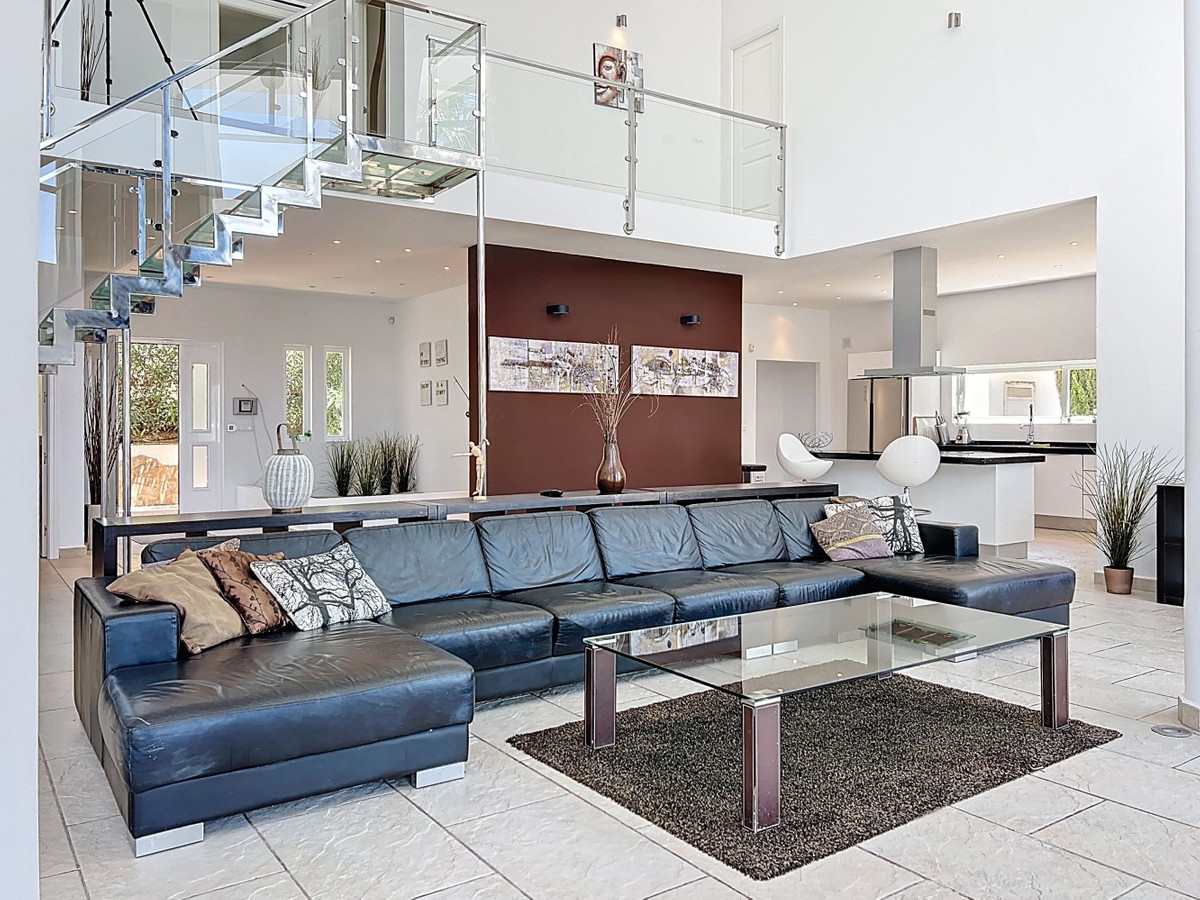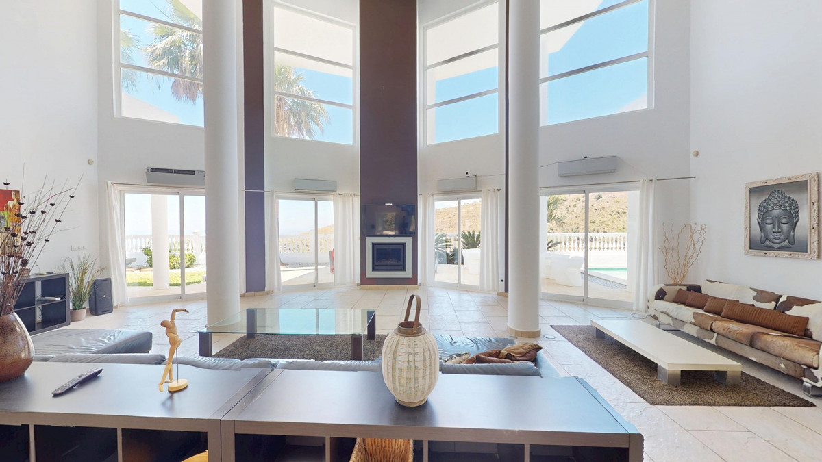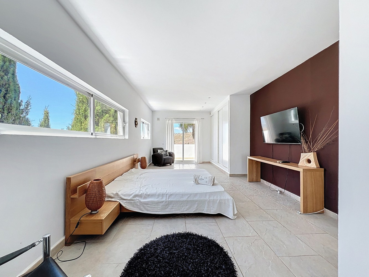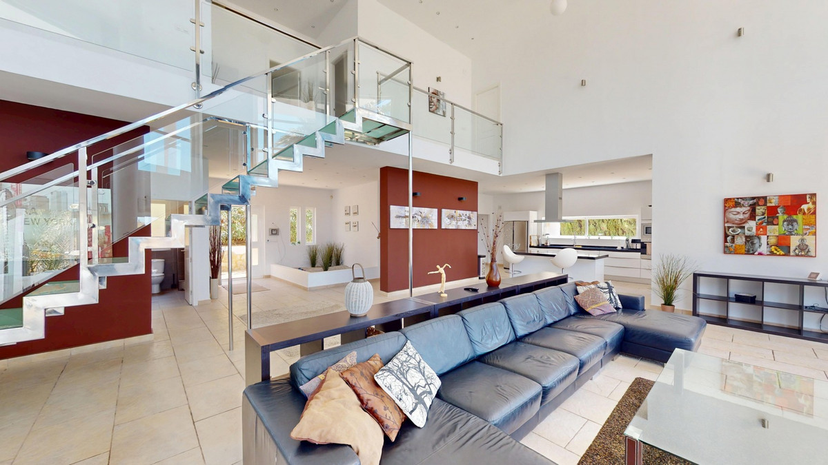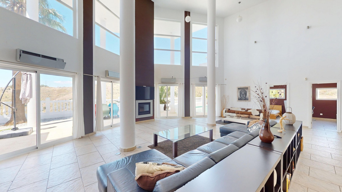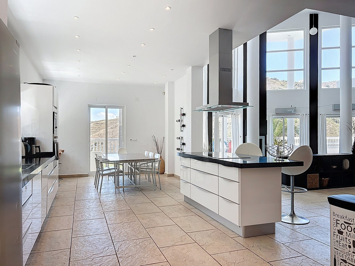 Deze indrukwekkende villa in Málaga, Spanje, biedt een harmonieuze mix van ruimte, luxe en modern design. Het pand beslaat 395,8 m2 verdeeld over twee verdiepingen en beschikt over 7 slaapkamers en 5 badkamers, wat het ideaal maakt voor grote gezinnen of mensen die graag gasten ontvangen. De begane grond, met een oppervlakte van 212,7 m2, heeft een adembenemende open woonruimte met hoge plafonds. Van vloer tot plafond geplaatste ramen en schuifdeuren vullen de ruimte met natuurlijk licht en bieden naadloos binnen- en buitenleven. De woonkamer wordt gekarakteriseerd door een strakke open haard en wordt aangevuld met comfortabele, moderne meubels. De state-of-the-art keuken is een droom voor elke chef-kok en biedt glanzende witte kasten, hoogwaardige apparaten en een royaal eiland met zitplaatsen aan de bar. Grote ramen bieden een prachtig uitzicht op het omliggende landschap terwijl je maaltijden bereidt. Een uniek kenmerk van de begane grond is de indoor zen-tuin, compleet met zand en decoratieve planten, die een rustgevende sfeer toevoegt aan de ruimte. De hallen zijn breed en goed verlicht, met zorgvuldig gekozen kunstwerken aan de muren. Via een moderne trap met glazen leuningen kom je op de tweede verdieping, die 183,0 m2 extra woonruimte biedt. De hoofdslaapkamer van 26,9 m2 biedt een prachtig uitzicht en een en-suite badkamer. De badkamers door het hele pand zijn stijlvol en modern, met grote tegels, inloopdouches en hedendaagse armaturen. Sommige badkamers hebben unieke ontwerpelementen, zoals douchgordijnen met een krantenprint, die een speelse touch toevoegen aan het anders minimalistische ontwerp. Buiten profiteert het pand van zijn verhoogde positie, met panoramisch uitzicht op de omliggende bergen, het platteland en de glinsterende Middellandse Zee. De buitenruimte heeft een groot zwembad, perfect om te ontspannen of te entertainen terwijl je geniet van het adembenemende uitzicht. Het pand biedt goede toegang en zorgt voor een gemakkelijke verbinding met nabijgelegen voorzieningen en attracties. Grote terrassen bieden voldoende ruimte voor buiten ontspanning en entertainment, waardoor deze villa de ideale plek is om in stijl van het Spaanse klimaat te genieten. Het kleurenschema van de villa is overwegend wit, wat een lichte, luchtige sfeer creëert die perfect past bij het Spaanse klimaat. Kleurrijke accenten in meubels en kunstwerken zorgen voor visuele interesse zonder de serene sfeer te verstoren. Deze villa is de belichaming van modern Spaans wonen, met ruime interieurs, hoogwaardige afwerkingen en adembenemende uitzichten, alles samengebracht in een indrukwekkend geheel een waar droomhuis. We zijn blij dat we dit droomhuis binnenkort aan u mogen voorstellen, hetzij persoonlijk, hetzij via een virtuele bezichtiging. Want deze wereld is uniek – net als onze Axarquía. In Andalusië. Aan de Costa del Sol. Hier, aan de zonnige kant van het leven…