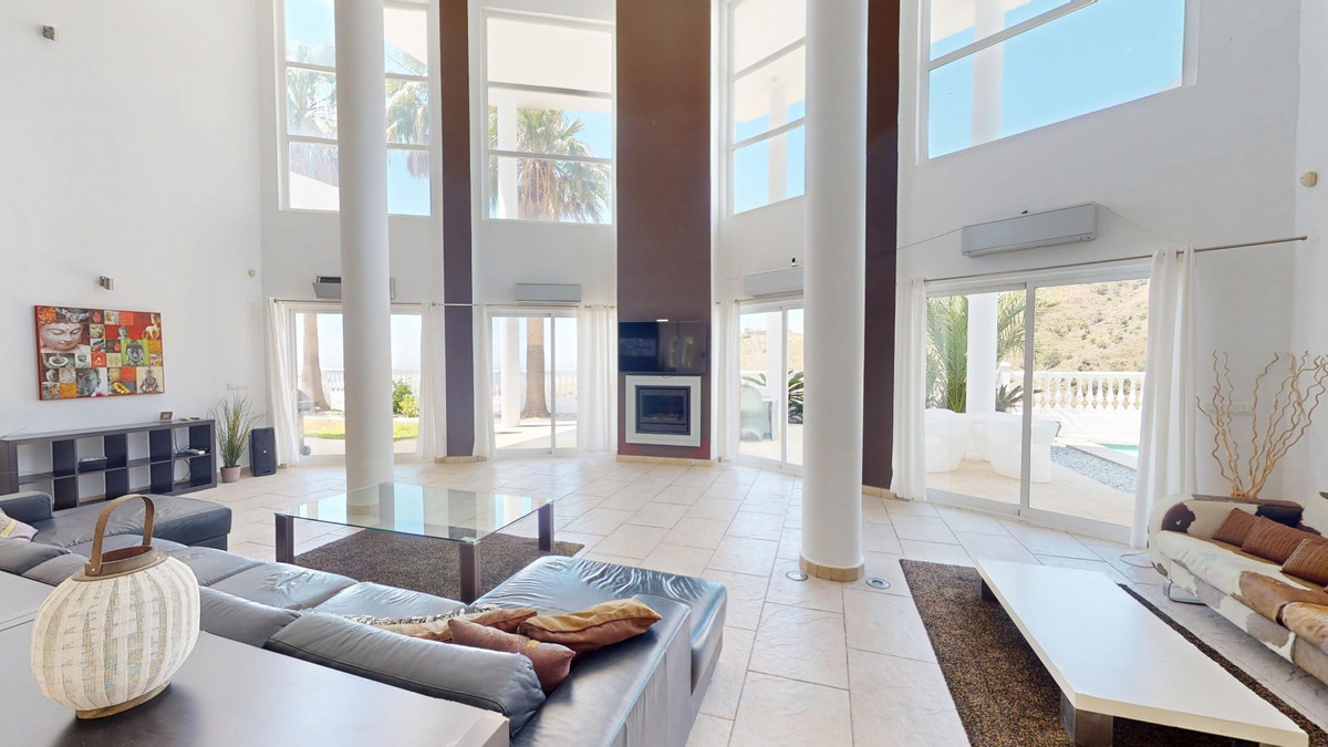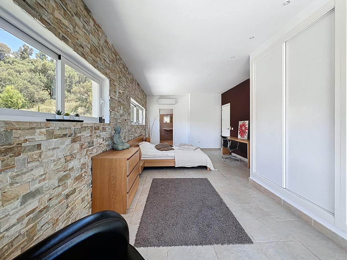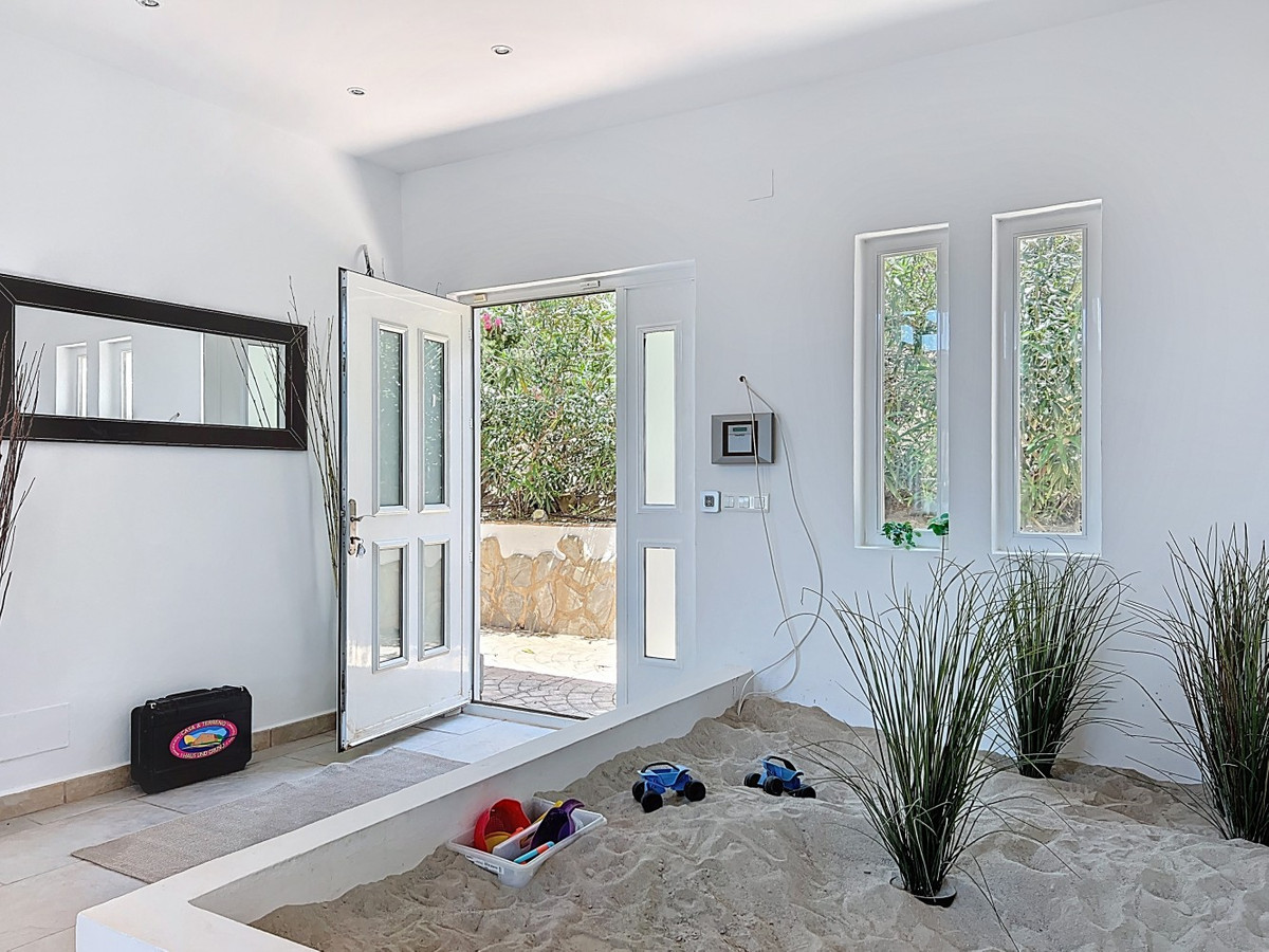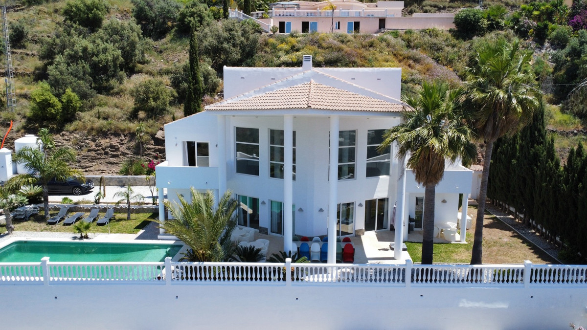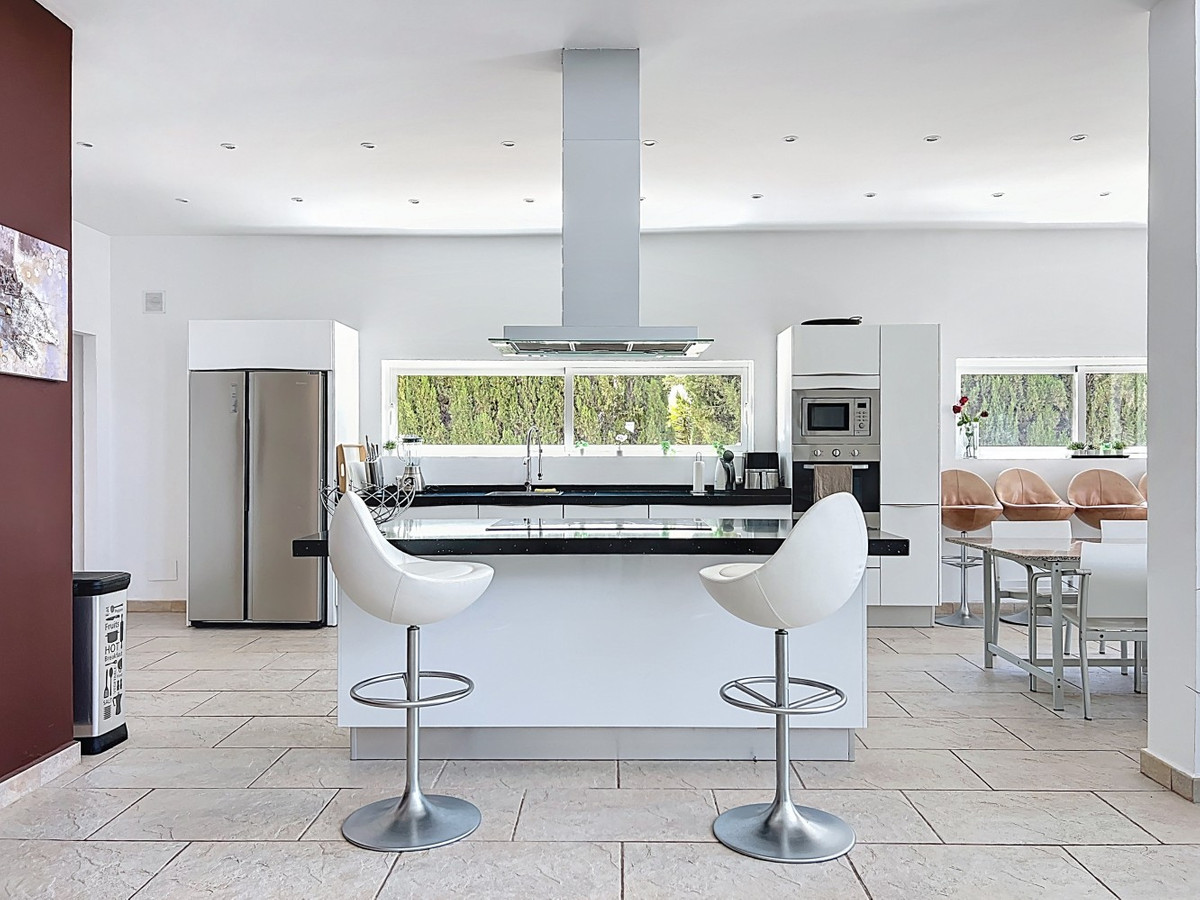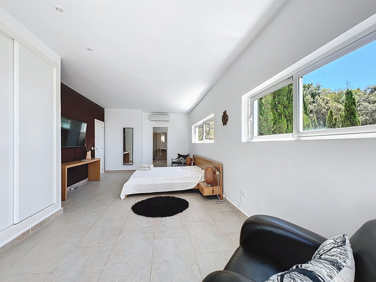 Deze indrukwekkende villa in Málaga, Spanje, biedt een harmonieuze mix van ruimte, luxe en modern design. Het pand beslaat 395,8 m2 verdeeld over twee verdiepingen en beschikt over 7 slaapkamers en 5 badkamers, wat het ideaal maakt voor grote gezinnen of mensen die graag gasten ontvangen. De begane grond, met een oppervlakte van 212,7 m2, heeft een adembenemende open woonruimte met hoge plafonds. Van vloer tot plafond geplaatste ramen en schuifdeuren vullen de ruimte met natuurlijk licht en bieden naadloos binnen- en buitenleven. De woonkamer wordt gekarakteriseerd door een strakke open haard en wordt aangevuld met comfortabele, moderne meubels. De state-of-the-art keuken is een droom voor elke chef-kok en biedt glanzende witte kasten, hoogwaardige apparaten en een royaal eiland met zitplaatsen aan de bar. Grote ramen bieden een prachtig uitzicht op het omliggende landschap terwijl je maaltijden bereidt. Een uniek kenmerk van de begane grond is de indoor zen-tuin, compleet met zand en decoratieve planten, die een rustgevende sfeer toevoegt aan de ruimte. De hallen zijn breed en goed verlicht, met zorgvuldig gekozen kunstwerken aan de muren. Via een moderne trap met glazen leuningen kom je op de tweede verdieping, die 183,0 m2 extra woonruimte biedt. De hoofdslaapkamer van 26,9 m2 biedt een prachtig uitzicht en een en-suite badkamer. De badkamers door het hele pand zijn stijlvol en modern, met grote tegels, inloopdouches en hedendaagse armaturen. Sommige badkamers hebben unieke ontwerpelementen, zoals douchgordijnen met een krantenprint, die een speelse touch toevoegen aan het anders minimalistische ontwerp. Buiten profiteert het pand van zijn verhoogde positie, met panoramisch uitzicht op de omliggende bergen, het platteland en de glinsterende Middellandse Zee. De buitenruimte heeft een groot zwembad, perfect om te ontspannen of te entertainen terwijl je geniet van het adembenemende uitzicht. Het pand biedt goede toegang en zorgt voor een gemakkelijke verbinding met nabijgelegen voorzieningen en attracties. Grote terrassen bieden voldoende ruimte voor buiten ontspanning en entertainment, waardoor deze villa de ideale plek is om in stijl van het Spaanse klimaat te genieten. Het kleurenschema van de villa is overwegend wit, wat een lichte, luchtige sfeer creëert die perfect past bij het Spaanse klimaat. Kleurrijke accenten in meubels en kunstwerken zorgen voor visuele interesse zonder de serene sfeer te verstoren. Deze villa is de belichaming van modern Spaans wonen, met ruime interieurs, hoogwaardige afwerkingen en adembenemende uitzichten, alles samengebracht in een indrukwekkend geheel een waar droomhuis. We zijn blij dat we dit droomhuis binnenkort aan u mogen voorstellen, hetzij persoonlijk, hetzij via een virtuele bezichtiging. Want deze wereld is uniek – net als onze Axarquía. In Andalusië. Aan de Costa del Sol. Hier, aan de zonnige kant van het leven…