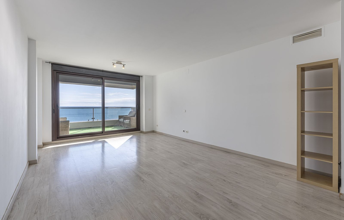 The property stands out for its impressive frontal sea views, which can be enjoyed from its spacious terrace, perfect for relaxing or sharing moments outdoors all year round. The living-dining room is bright and spacious, with direct access to the terrace and a layout designed for maximum comfort. (Image of the living room recreated with virtual home staging)