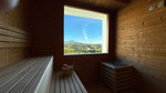 The open-plan living and dining area is bathed in natural light through floor-to-ceiling windows that frame the panoramic coastline. A fully equipped contemporary kitchen with a separate laundry area offers serene countryside and mountain vistas.