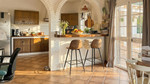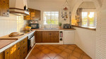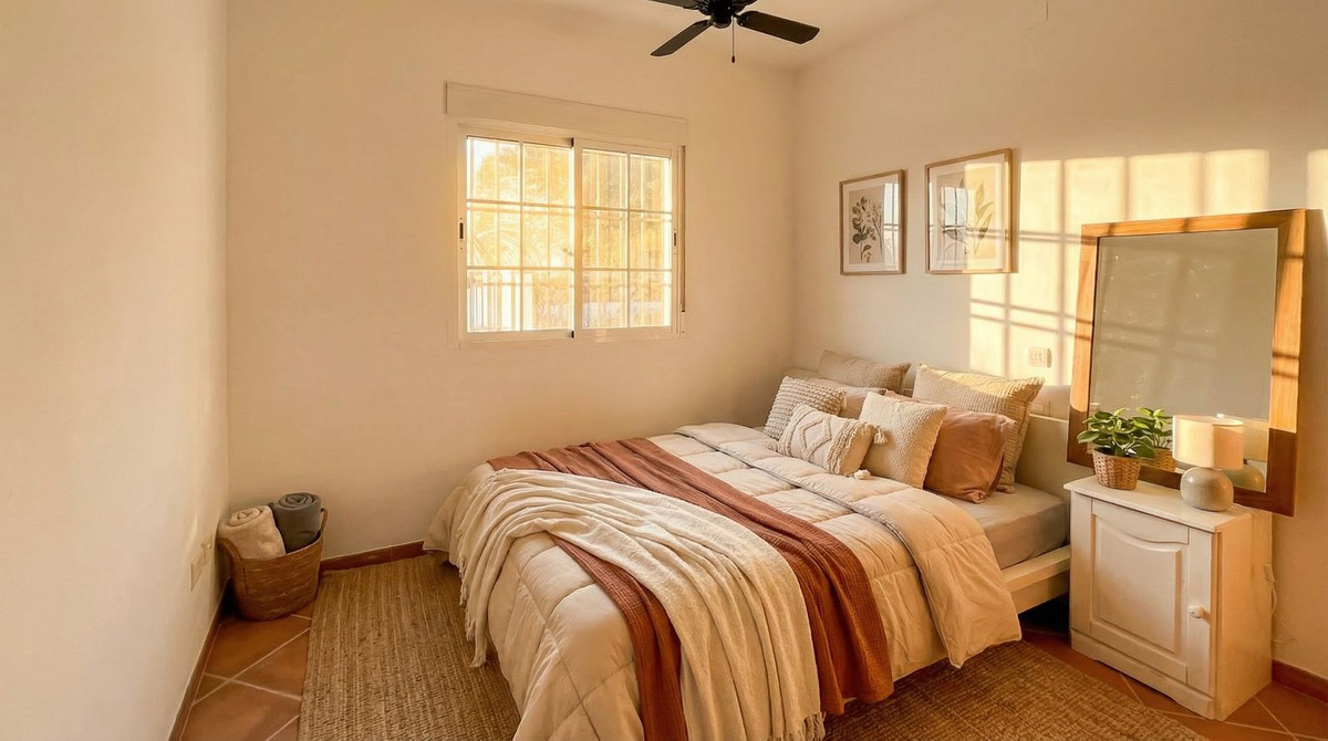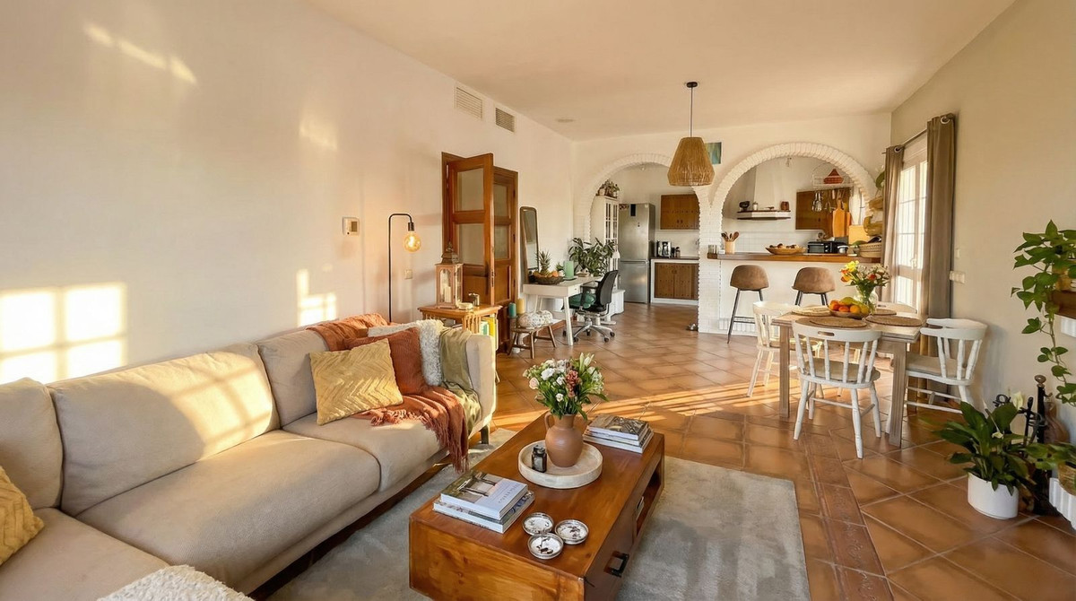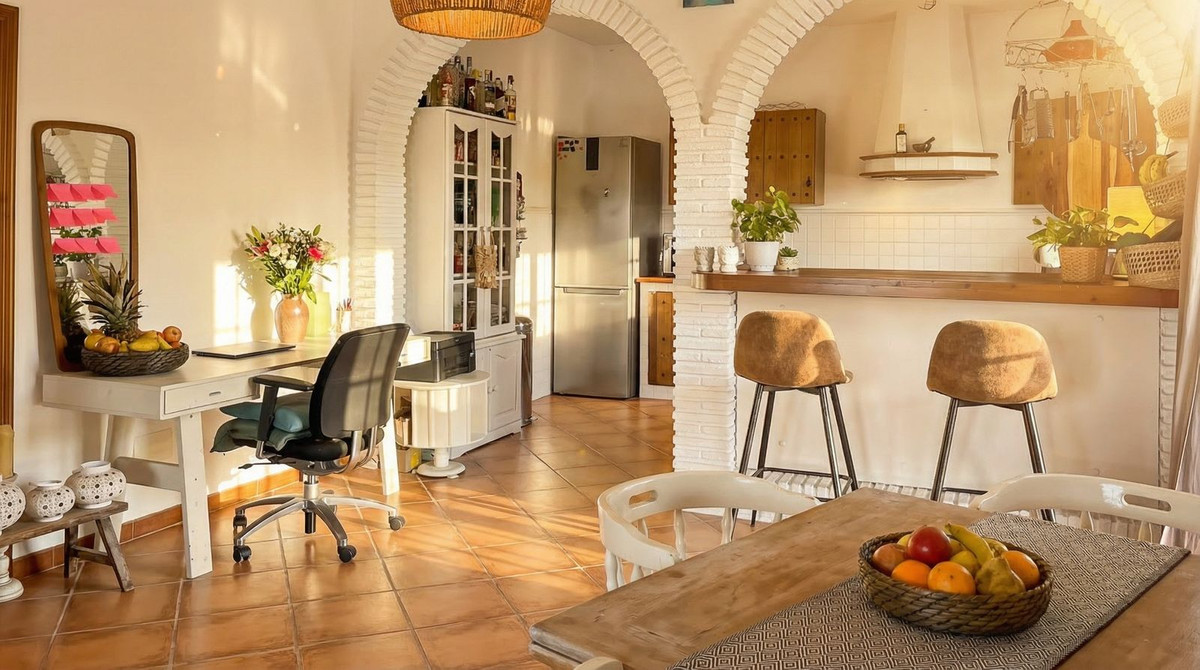 Binnen straalt de villa warme Andalusische charme uit, met terracottavloeren en elegante bogen, gecombineerd met een open indeling die direct in verbinding staat met het terras en het zwembad. De leefruimte bestaat uit een open keuken met ontbijtbar en een ruime, uitnodigende woonkamer.