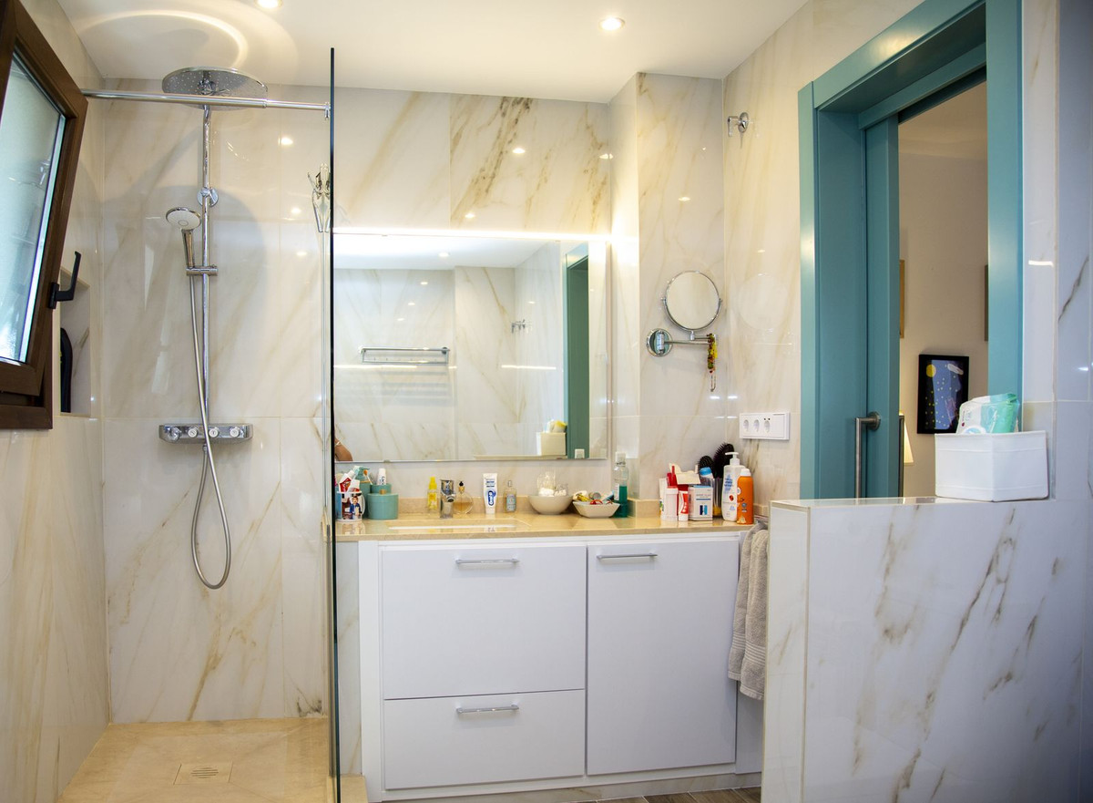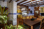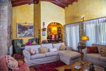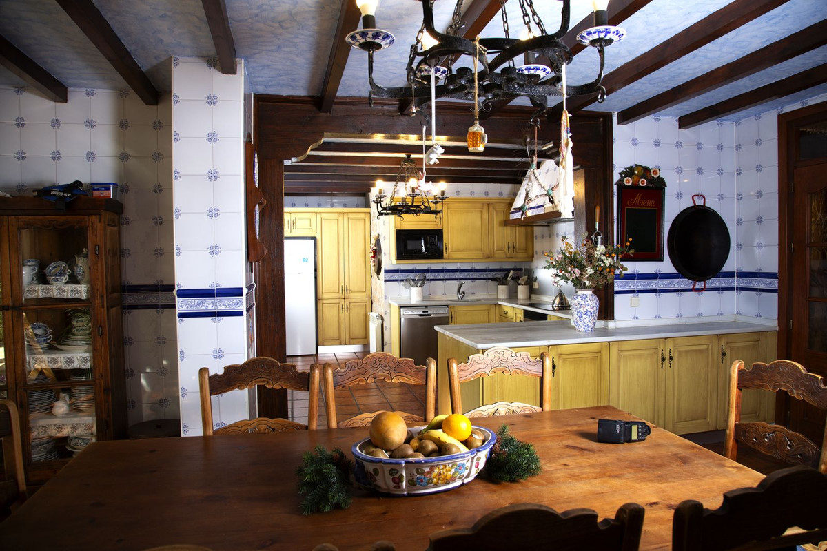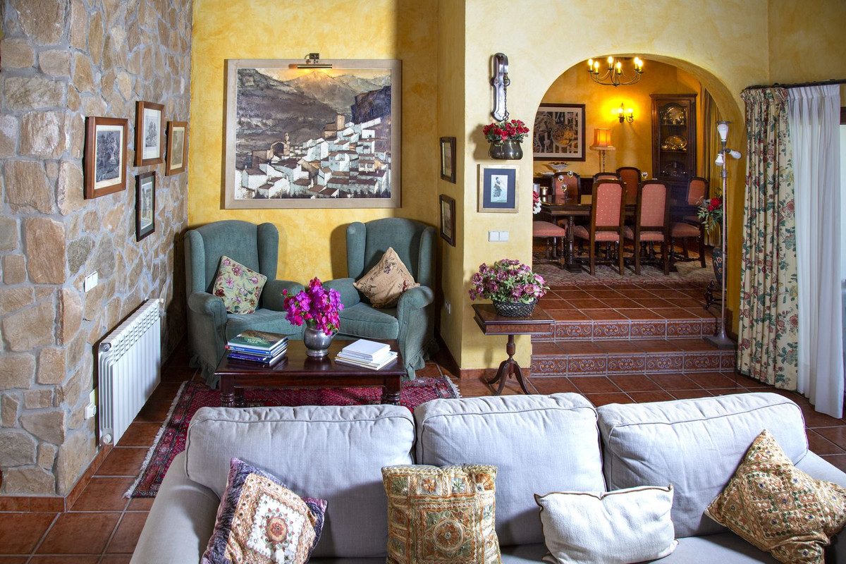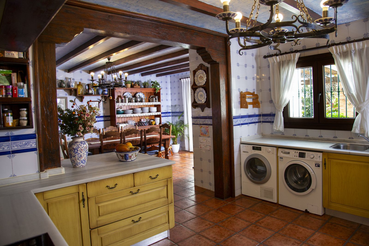 Charming villa in La Cala Golf area. The villa's interior has just been painted entirely white to give it more light and further enhance its Andalusian farmhouse feel. Furthermore, it has received permission to drill a well, which will be carried out as soon as possible. Villa with 6 bedrooms with 4 bathrooms and toilet. The property consists of 575 m2 built, as well as charming outdoor spaces, such as porches, terraces, patios totalling 144 square metres, and gardens throughout the property to enjoy different sensations, environments and views. The property is situated on a plot of 10.000 m2, where there are, apart from the house, wide spaces to enjoy different activities: the swimming pool area of 12 metres long, surrounded by a large bermudagrass lawn, to swim, sunbathe and relax or practice some sport on the high quality tennis court with night lighting . A building of 85 m2 independent of the house, formerly used as stables, is now converted into an office and workshop equipped with all the machinery and tools necessary for the maintenance of the estate. This building, if desired, could easily be converted into a guest or staff house. The property has splendid gardens all around the plot. The property is distributed on two floors: on the ground floor, there is a large entrance hall with double height and wooden coffered ceiling, a guest toilet, the dining area, kitchen, office and living room. In the west wing there is a bedroom with bathroom ensuite, dressing room and direct access to the porch and garden and 2 bedrooms with a bathroom. In the east wing there is a bedroom with bathroom ensuite and private terrace with pergola, ideal for guests and the garage with space for two cars. All around the house there are different terraces, porches and designer patios. On the upper floor, going up the stairs, with a spectacular coffered wooden ceiling in the form of a tower, there is a large hallway that leads to 2 bedrooms with access to the terrace, a bathroom and a large office/library room that can be used for different purposes depending on the needs. In this property you will find everything you need to be able to relax, work from home if necessary in a private and quiet way or simply exercise at home surrounded by nature. As you walk through the property you will discover charming corners and carefully decorated, making it incredibly cosy. If you are looking for a property with these characteristics, do not hesitate to contact us and make a visit. The property has photovoltaic panels that provide a self-supply of 50% of the total energy consumed during the year, practically during the day. 10 min La Cala de Mijas with its amazing beaches on the Mediterranean Sea and all the necessary services. 20 min by bike if you want to exercise at the same time. 5 min to La Cala Golf Resort, for those who like to practice this sport or simply go to the SPA area or to the restaurants and leisure areas. 5 min to Santana Golf 10 min to Mijas Golf 5 min to equestrian facilities 10 min to international schools ( English and German) 15 min to Fuengirola. 30 min Marbella, Puerto Banus 25 min AGP Malaga, Malaga International Airport 30 min Malaga City