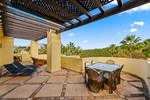 Het terras is grotendeels onoverdekt en biedt verschillende plekken om buiten te eten, gasten te ontvangen en te zonnen, terwijl u geniet van een open uitzicht op de bergen, waaronder Los Reales, en gedeeltelijk uitzicht op zee.