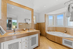 Er is een grote woon- en eetkamer met open haard, veel natuurlijk licht en directe toegang tot het terras. De keuken is extra groot, volledig uitgerust met Bosch-apparatuur en heeft een aparte bijkeuken en wasruimte. Alle kamers, inclusief de keuken en alle badkamers, hebben veel natuurlijk licht.