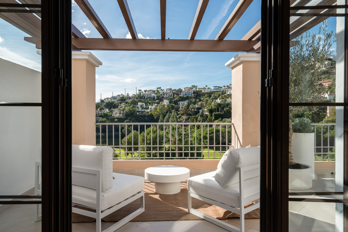 Grote openslaande deuren vullen het interieur met natuurlijk licht en frame panoramisch uitzicht op de omliggende bergen en golfbaan, waardoor de schoonheid van de natuur moeiteloos binnen kan stromen. Het resultaat is een serene, moderne heiligdom dat de essentie van elegante Costa del Sol leven vangt. Bewoners genieten van meerdere zwembaden, prachtig onderhouden tuinen en beveiligde ondergrondse parking met een eigen berging en directe lift. Met de voorzieningen van Los Halcones en de charme van San Pedro op slechts enkele ogenblikken afstand, biedt dit penthouse de perfecte balans van gemak, privacy en verfijnd leven. Let op: de vraagprijs is exclusief alle meubels. Een apart meubelpakket is beschikbaar en de kosten kunnen worden besproken met uw verkoopadviseur.