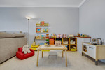Upon entering, you are welcomed by a charming entrance hall leading to a bright and spacious living area with a dining space and direct access to a large glazed terrace with custom-built carpentry storage. This versatile space can be used as an outdoor dining area, reading nook, playroom, or home office. The terrace offers lovely views over the community gardens, pool, and lush greenery.