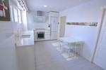 The kitchen is fully fitted and equipped with high-end appliances, complemented by a generous pantry and a separate laundry room. The property boasts cream-coloured porcelain stoneware flooring, integrated hot and cold air conditioning throughout, and two independent entrances: a main entrance and a service entrance.
