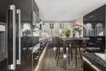 The modern, fully equipped kitchen boasts sleek design details with granite countertops and high-gloss black and red cabinetry, combining functionality with style.
