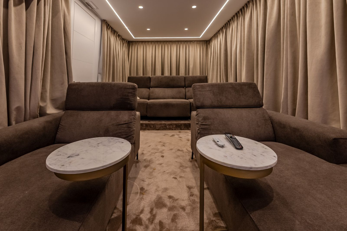 - De kelder herbergt een grote bergruimte, een volledig uitgeruste wasruimte, een garage voor twee auto’s, een badkamer met douche en een comfortabele minicinemazaal.