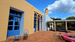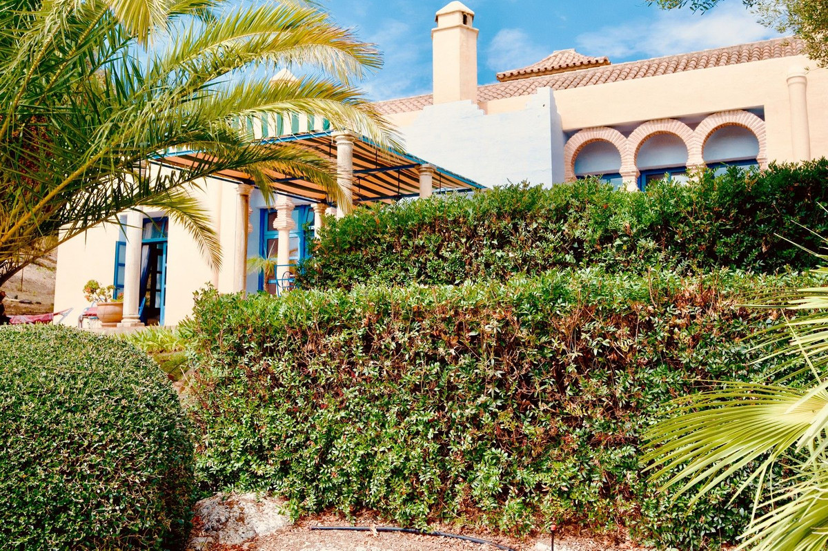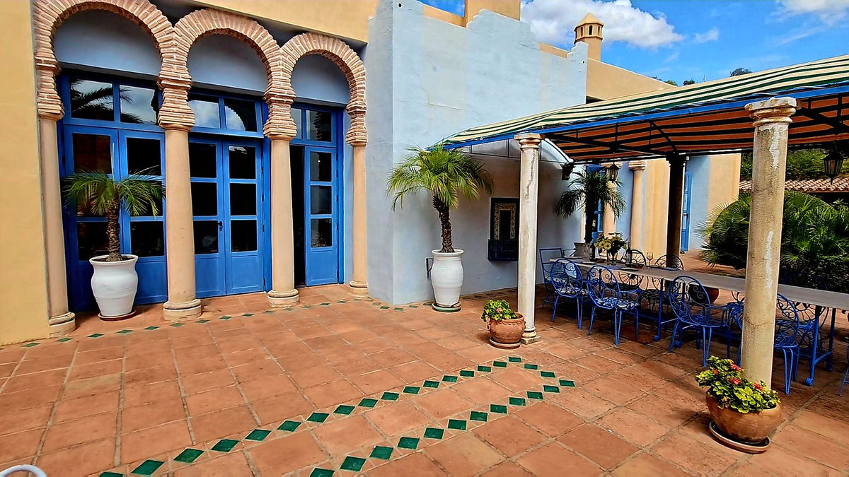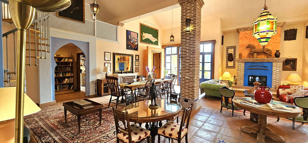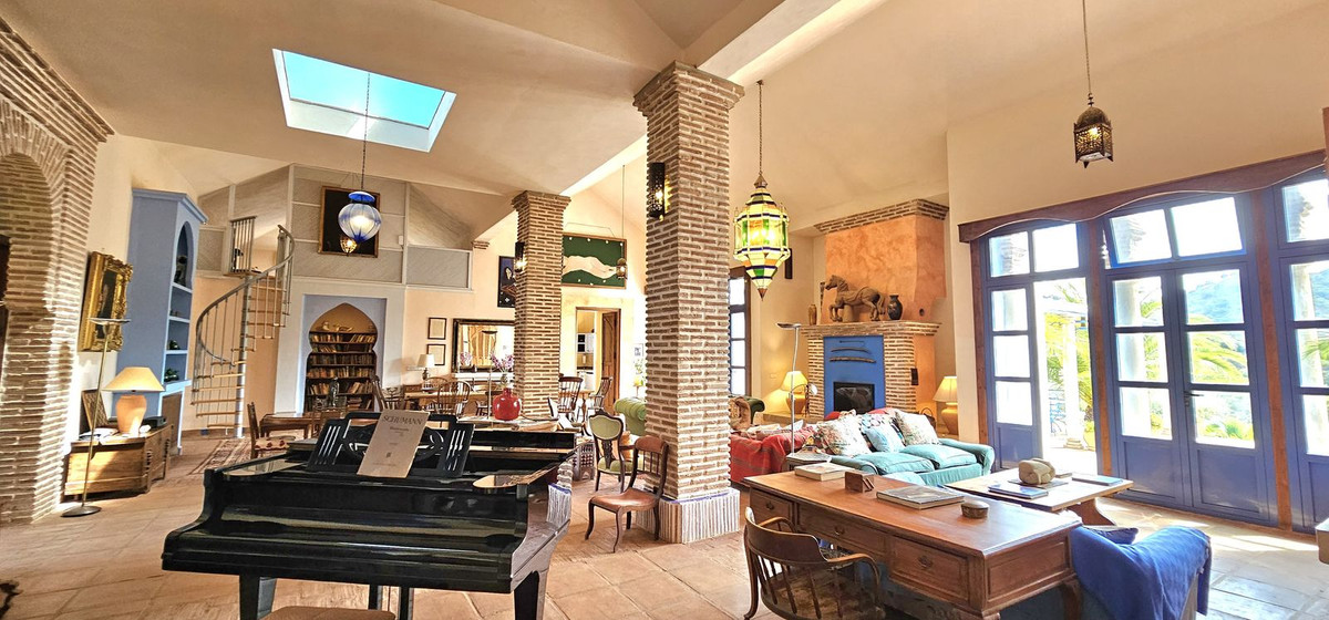 Access to the property is via a short dirt road that leads to a private electric gate, shared with just four other properties. As you ascend to the mountaintop, you'll be greeted by an imposing antique wooden door that ushers you into a grand entry hall. To the left and right, you'll find two en-suite guest bedrooms. Straight ahead, the magnificent living room beckons, cleverly divided into distinct areas by elegant pillars—an inviting lounge area with a generous fireplace, a dining area adjacent to the well-appointed kitchen, and a cozy music or study nook. French doors open seamlessly to the terrace, providing unobstructed views of the surrounding landscape and mountains. When all the doors are open, the distinction between indoor and outdoor living fades, allowing you to fully savor the Andalusian outdoor lifestyle.