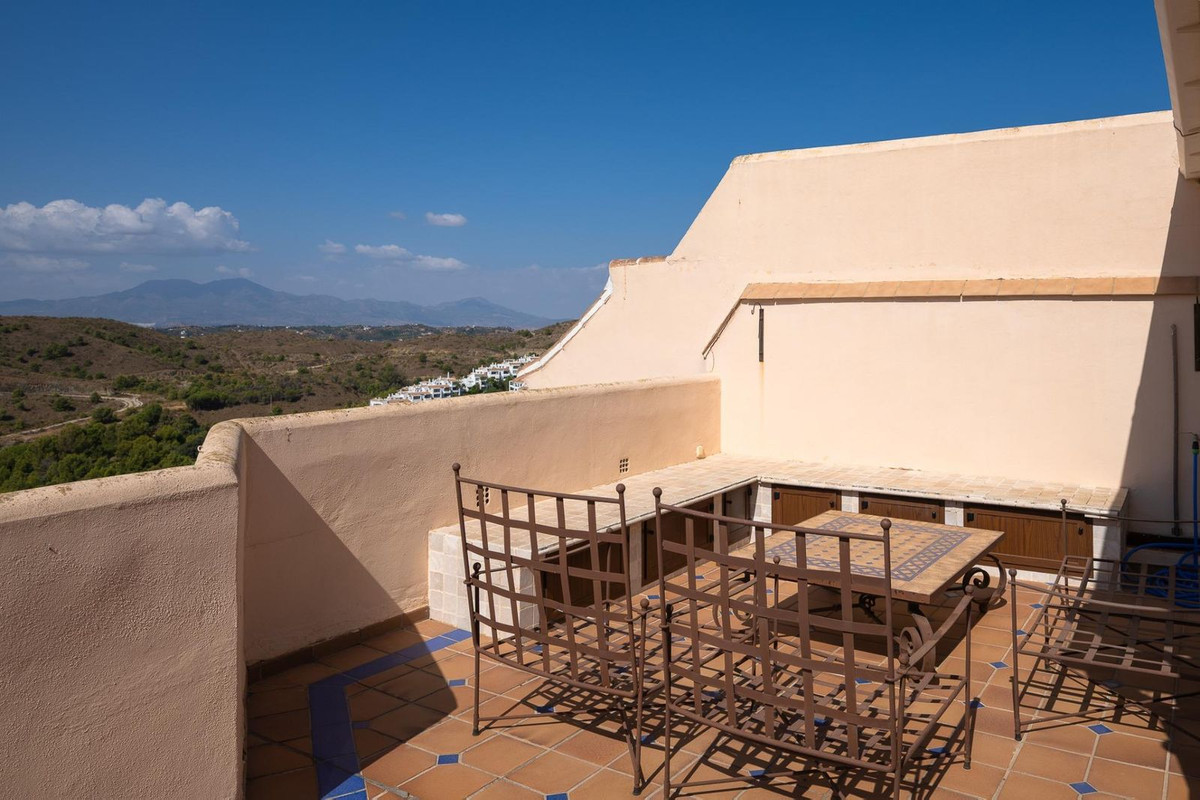 Stunning duplex in Alhaurin Golf with exceptional views of the golf course and in an impeccable condition. The property is very spacious and consists of a large living-dining room with a fireplace opening onto a fabulous and spacious fully glazed terrace with spectacular views of the course. There is also a large fully equipped kitchen as well as two double bedrooms, one en suite and with direct access to the terrace as well as a second bathroom. Upstairs there is a third bedroom and another bathroom and an additional bonus is a second summer lounge ideal for family gatherings. From here we access to a beautiful terrace with a barbecue area and unbeatable 360ยบ views. Also there is a parking space, storage room, swimming pool and communal gardens. A property with many possibilities and great potential.