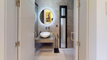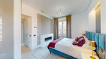 The high-end kitchen features an invisible hob integrated into the countertop, while the expansive open-plan living, dining, and kitchen area boasts a striking "cathedral" ceiling. An artistically designed, illuminated corridor connects two of the bedrooms and bathrooms, leading to the master suite with its own ensuite and dressing area. All bathrooms benefit from natural light.