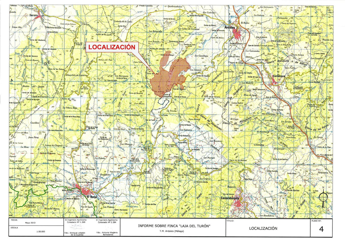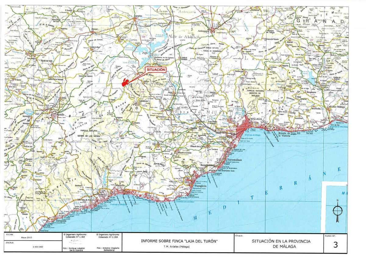 Impressive country estate close to Málaga, possibility to build. Rural property of 313 hectares (3.130.000 sqm or 773,44 acres) located in the Municipality or Ardales in Málaga Province. It has buildings of more than 2,500 m2 built, within a Non-Developable Land without special protection. It is possible, therefore, to develop transformation projects in it, allowing the construction of between 10 and 15 independent villas, a hotel and/or a large equestrian center. The entire area of the land is currently used for rainfed cereal cultivation (190 ha) and olive groves (80 ha), with the rest being used for forest and pasture. The estate is also an authorised hunting area in operation. The land is now aimed for cereal (1.900.000 sqm) and olive grove (800.000 sqm), leaving a wide area to free spaces of grassy scrubland mature trees hills. Besides that, the property is a running hunting ground, fully authorized. It is actually zoned as a rural (non-urban) area under no special limitations. Due to the lack of any special urban constraints, the plot may be subject to urban activities or transformation. The estate is located at the bottom (but out) of the Sierra de las Nieves, a Nature Reserve legally protected as a National Park —one of the 17 existing in Spain—, a place of a unique beauty and very rare natural conditions: it is even possible to see wild mountain goats on the fields —not to mention the extraordinary play of boars and deers actually hunted in the existing hunting ground of the estate. A Spanish firs colony, the southernmost of Europe, spreads out just a few meters away from the boundaries. By the other side of the land, to the West, the property is surrounded by a governmental mountain of public use —entitled to the Agencia Andaluza del Agua—, colonized by a magnificent Mediterranean pine forest, fully protected and publicly open without any restriction, an area that truly extents the possibilities of beneficial use and enjoyment of the plot, in an extraordinary manner. In any case, the estate is outside the territory subject to restrictions as a result of the National Park, and is therefore not affected by those restrictions. The estate has a very addecuate location regarding the infrastructures of the area: just 10 minutes away from the town of Ardales and, from there, 30 minutes far from the Málaga Airport by the new Málaga-Sevilla highway (fully approved and partially built through the first 30 kms. stretch), 20 minutes away to the high-speed train Santa Ana Station (AVE), in Antequera, and 1 hour from Marbella. Through the very estate, it runs the Turón river, the most important tributary of the main Málaga dam (pantano del Guadalhorce), a very stable watercourse, with a significant water level, which provides its habitat to the wild mustelids that can be seen on its banks, an important river of limpid waters that runs among ponds, small lakes and noisy waterfalls, shaping an alluring nature gully, crowned by rugged rock formations that give its name to the estate ("La Laja del Turón"), rock walls that are one of the preferred destinations for the climbing sport in Málaga province. In the estate, there is a very large farmhouse, in a good state of conservation and in full farming service: it is equipped with two service dwellings, of moderated dimensions, several well connected farm buildings, of about 2.500 m2, with a detached box stalls building for housing horses. The plot is provided with another two former farms wrecks, quite distant to each other. All of the buildings are legally subject to reconstruction, that will allow the execution of any kind of farm or ranch, with its complementary farm facilities. Location coordinates of the estate in Google Earth are as follows:..36 ° 50'40.47 ".N 4 ° 53'44.17" O.