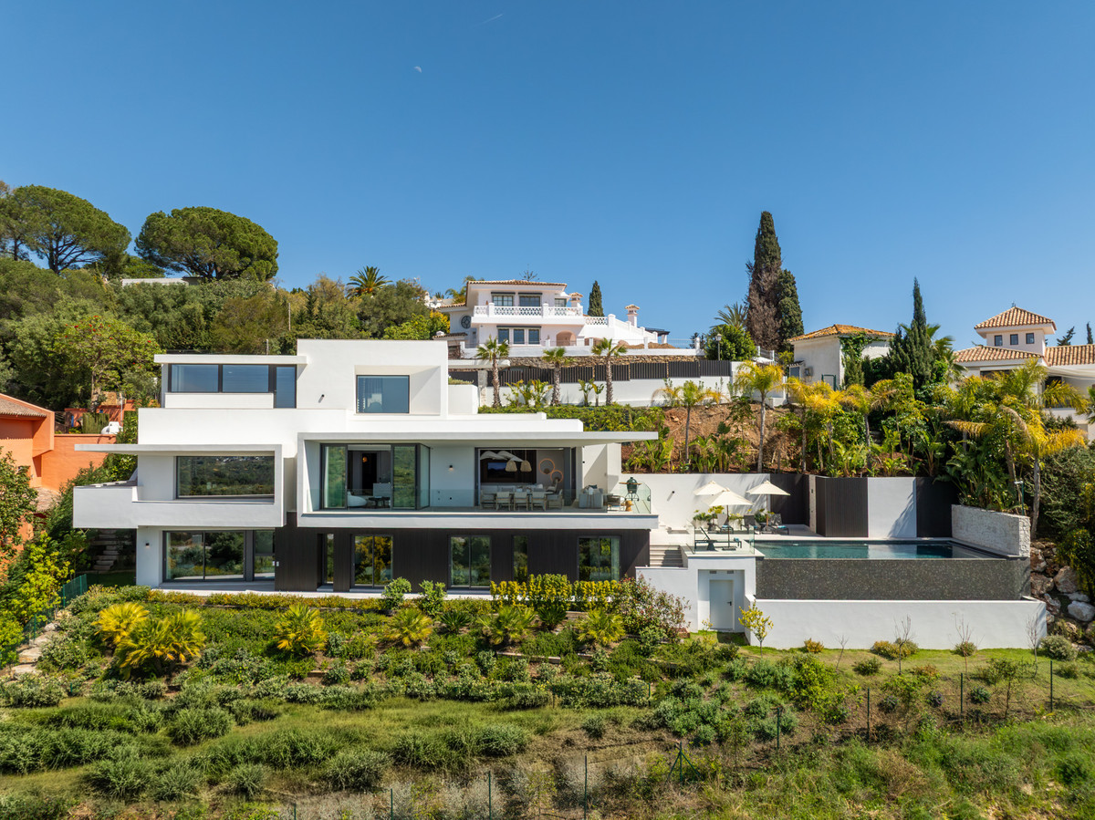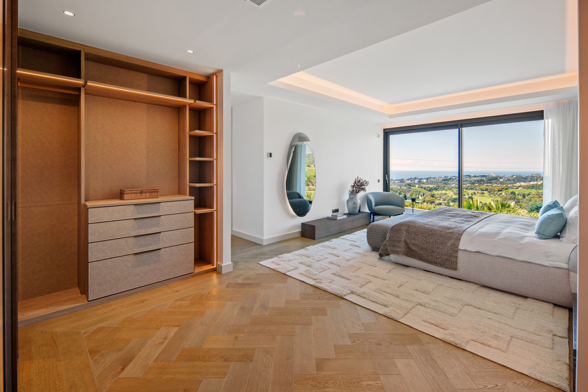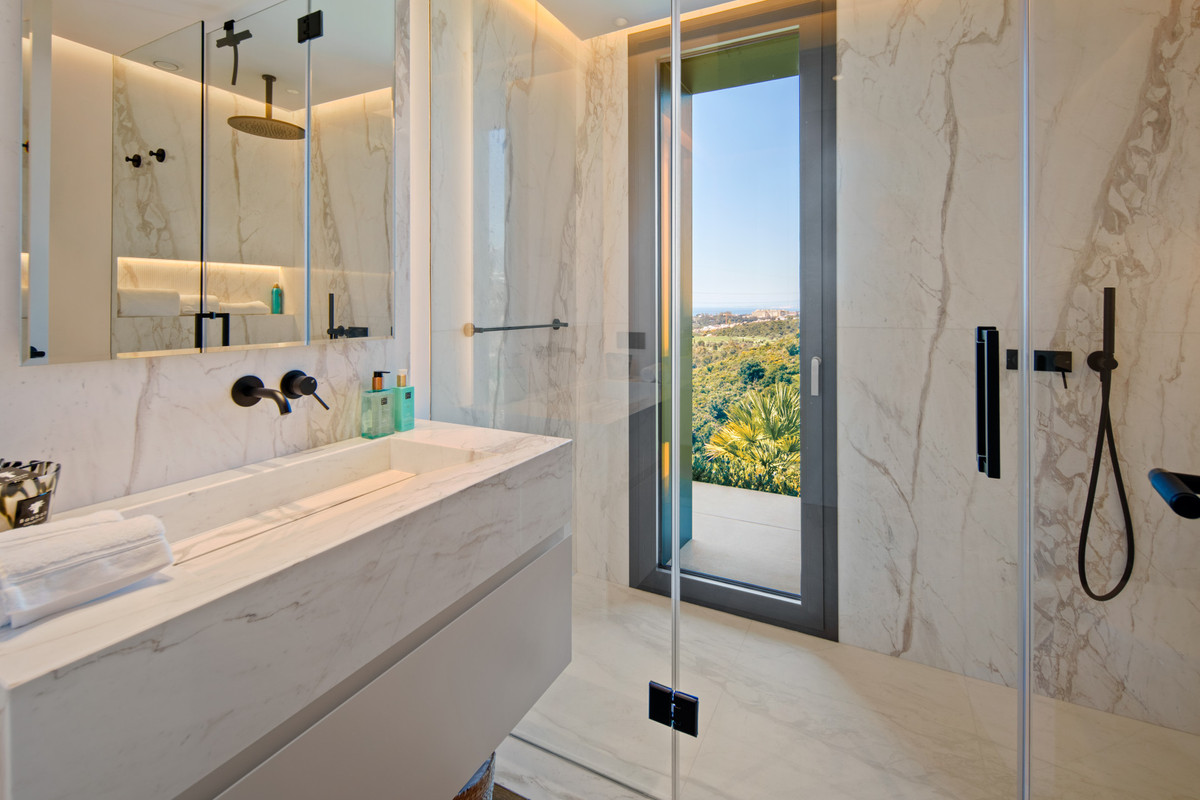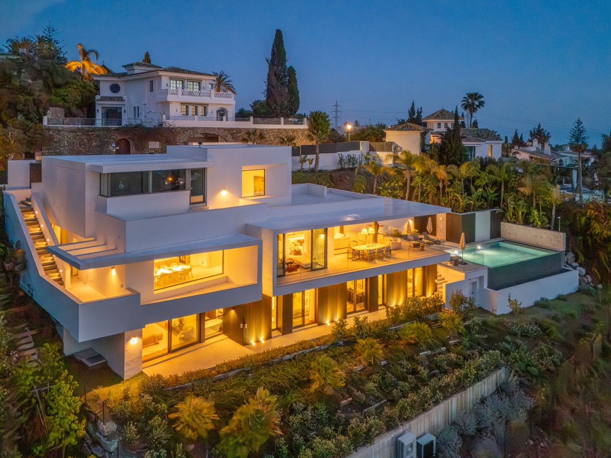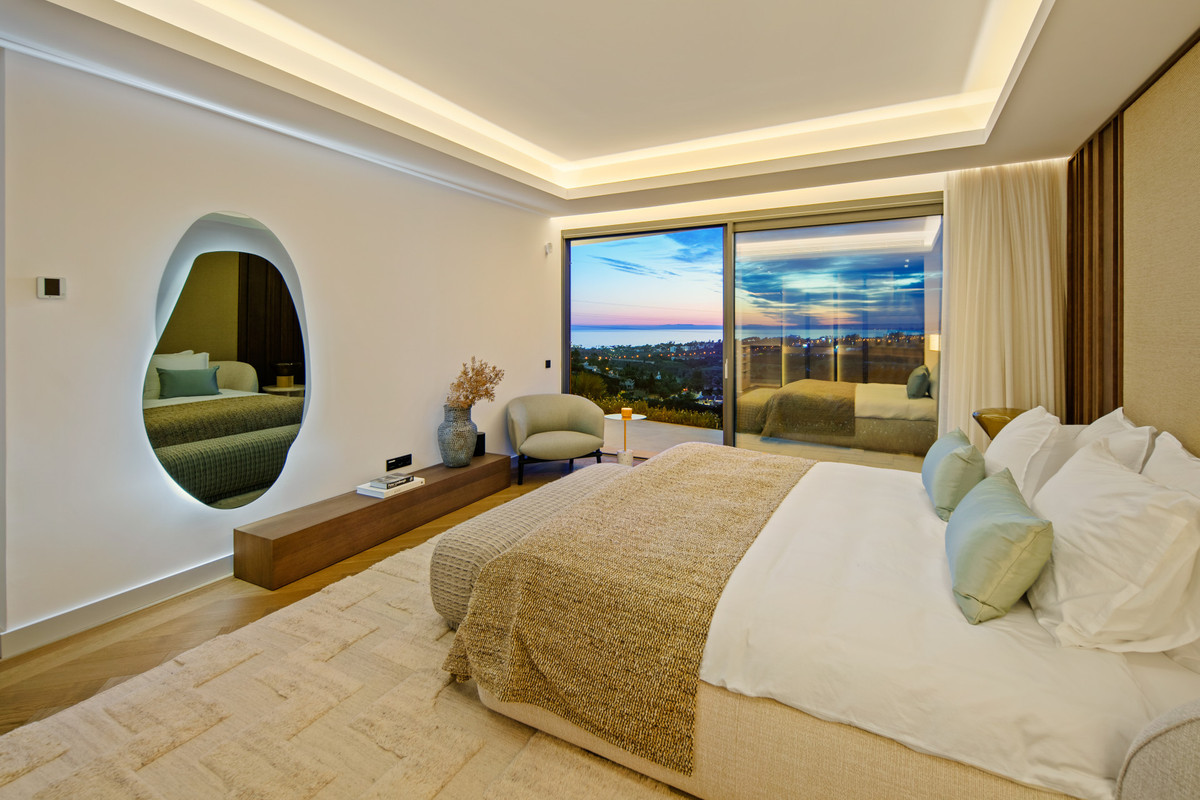 Inside, the villa is finished to a high standard with elegant stone surfaces, warm wood cabinetry and discreet lighting. Generous bedrooms include stunning ensuite bathrooms, while the master suite offers direct terrace access and panoramic sea views. With its modern design, private setting and exceptional vistas, El Rosario 430 is a standout contemporary home in Marbella East.