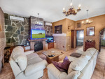 De woonkamer is traditioneel van stijl en heeft een open haard.