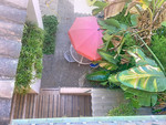 The private plot features two patios. The entrance patio includes a porch and a covered carport for two vehicles, providing access to the house. On the main floor, the property offers a spacious living-dining room with a fireplace and marble floors, creating an elegant and welcoming atmosphere. The kitchen, semi-open in style and fully equipped for daily use, connects both to the dining area and the entrance patio. This floor also includes a guest toilet for added convenience. From the living-dining room, there is access to a 40 m² covered terrace, perfect for enjoying the Mediterranean climate. Downstairs, the terrace connects to the front patio—a space with abundant vegetation and shade that, in addition to having side access from the street and offering an independent entrance to the guest apartment, features a gate with direct access to the communal swimming pool.