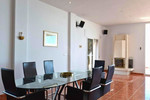 On the other side of the living room lies the dining area, followed by the fully equipped kitchen and, next to it, an additional guest bathroom.