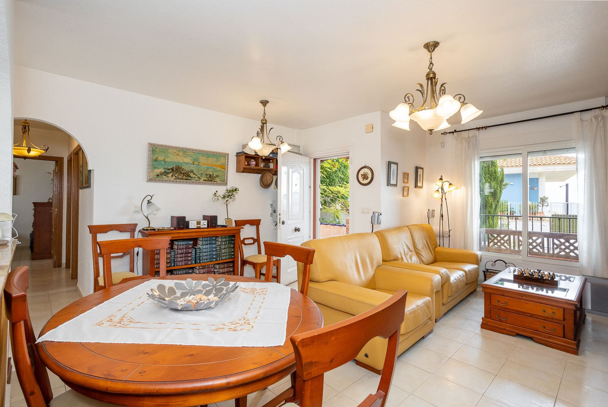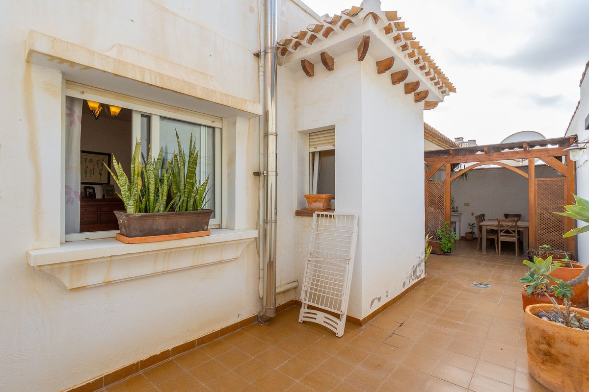 Rijtjeshuis met patio, dakterras en garage. Gedeeld zwembad. Welkom bij El Carmoli, dit goed geplande herenhuis met een groot terras, dakterras en garage in de kelder. Gemeenschappelijk zwembad op een mooie locatie.