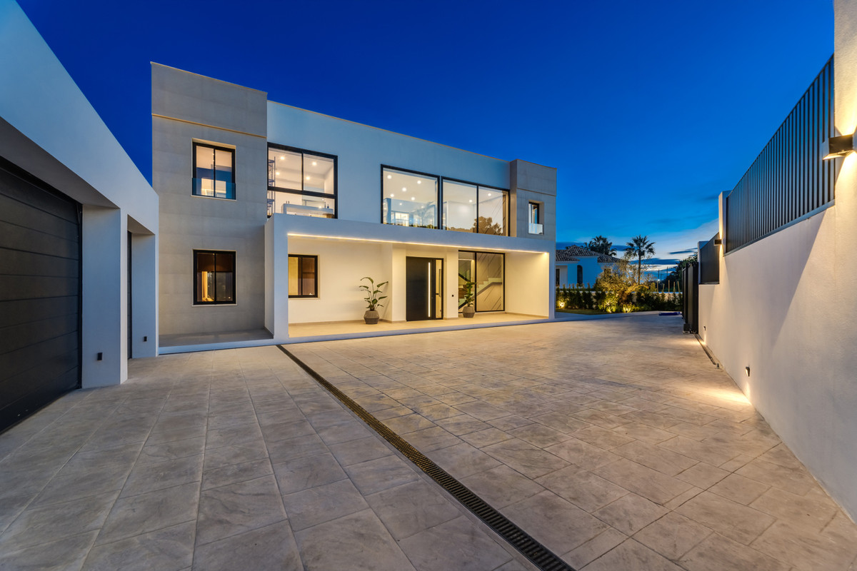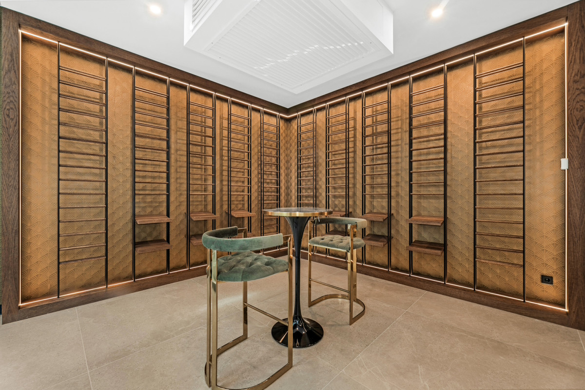 De master suite biedt twee en-suite badkamers en twee inloopgarderobes. Extra kenmerken zijn een personeelskamer, wasruimte en een garage voor vier auto’s. De villa is ook uitgerust met de nieuwste OLED-tv en een BOSE-geluidssysteem met AI-integratie.
