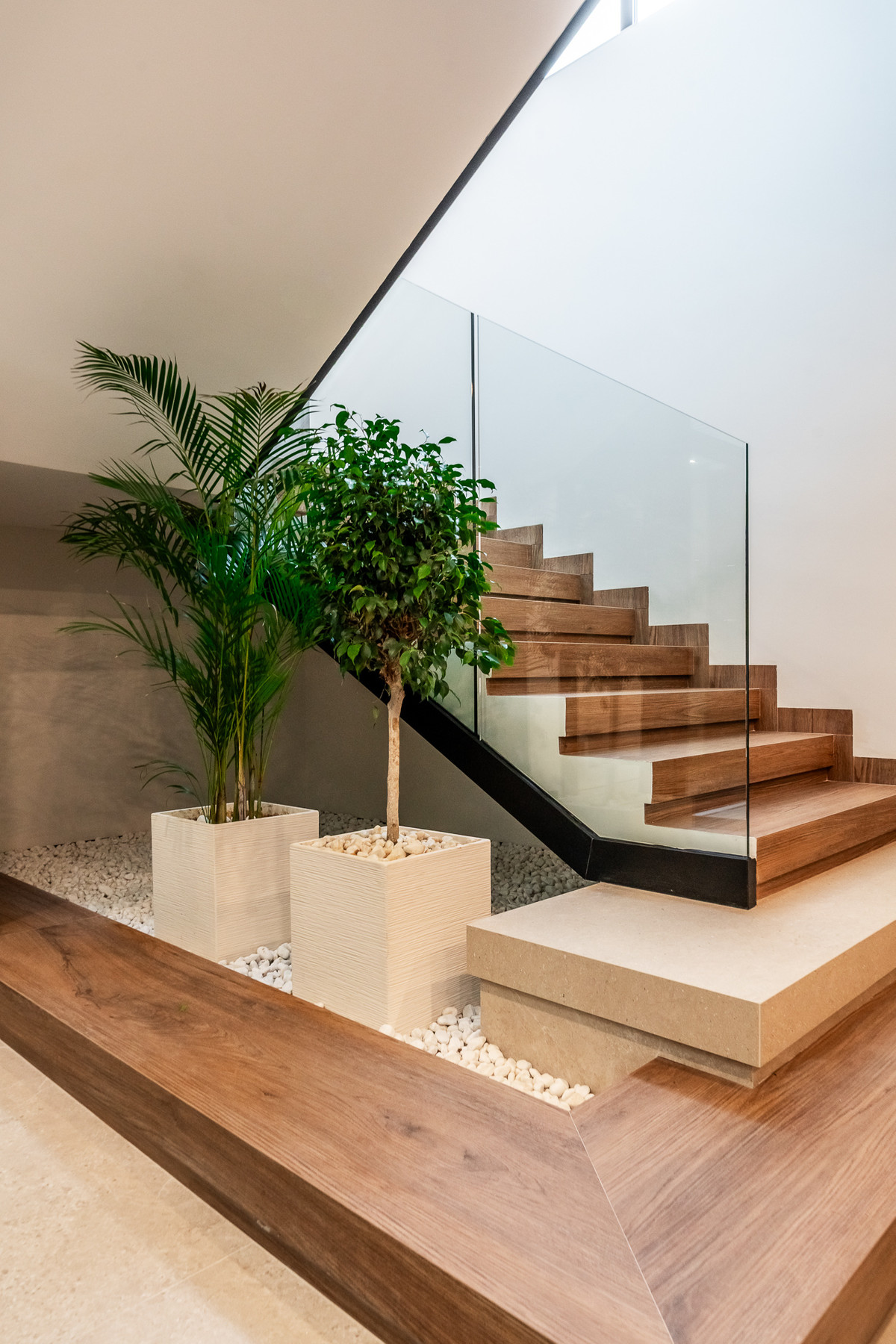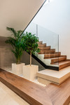 Het huis is verdeeld over drie niveaus en omvat een luxe spa met verwarmd binnenzwembad, Finse sauna, Turks bad, volledig uitgeruste gym, speelkamer, bar en wijnkelder. Twee glazen kubussen en vloer-tot-plafond ramen creëren lichte, open ruimtes vol natuurlijk licht.